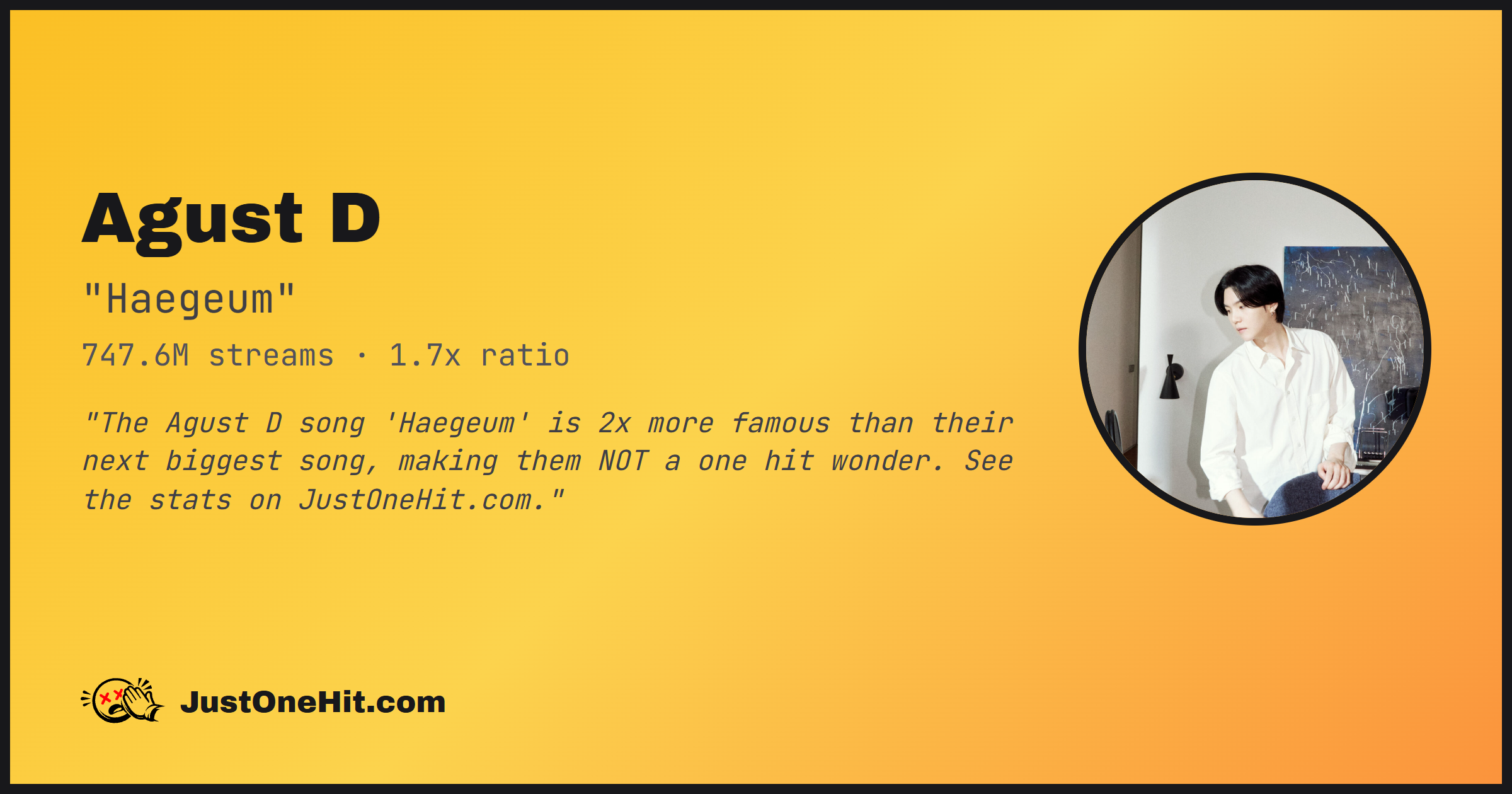 "The Agust D song 'Haegeum' is 2x more famous than their next biggest song, making them NOT a one hit wonder. See the stats on JustOneHit.com."