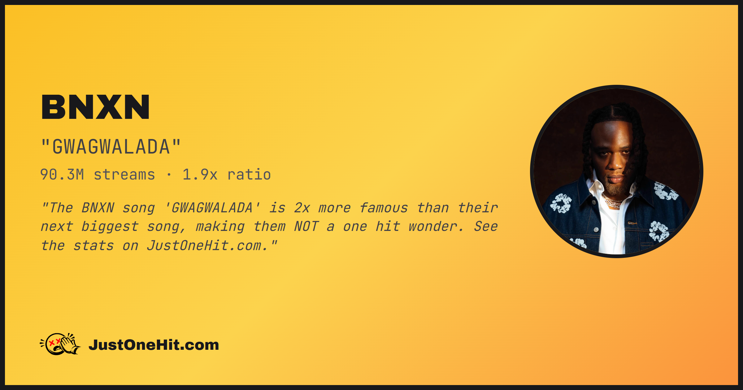 "The BNXN song 'GWAGWALADA' is 2x more famous than their next biggest song, making them NOT a one hit wonder. See the stats on JustOneHit.com."
