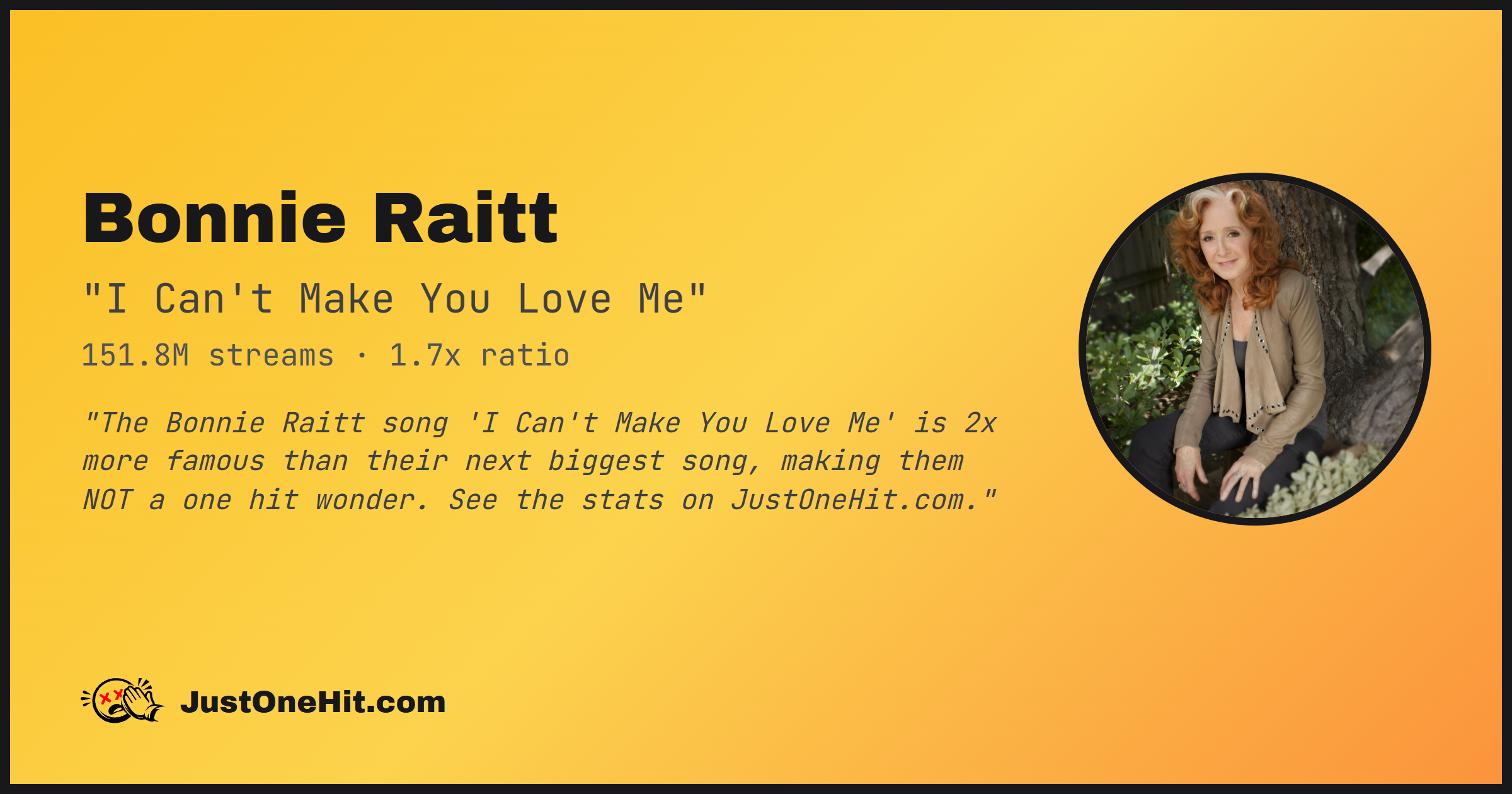 "The Bonnie Raitt song 'I Can't Make You Love Me' is 2x more famous than their next biggest song, making them NOT a one hit wonder. See the stats on JustOneHit.com."