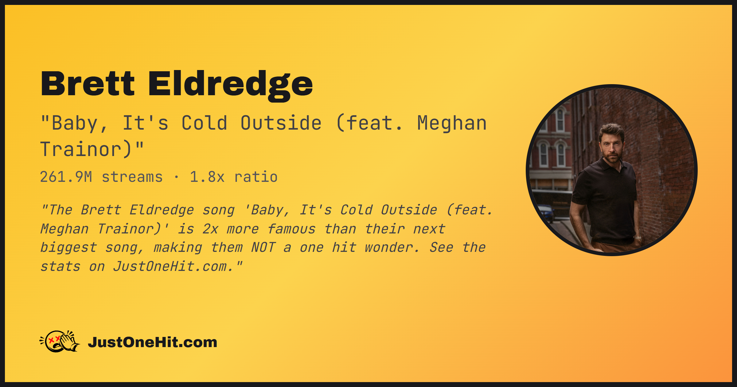 "The Brett Eldredge song 'Baby, It's Cold Outside (feat. Meghan Trainor)' is 2x more famous than their next biggest song, making them NOT a one hit wonder. See the stats on JustOneHit.com."
