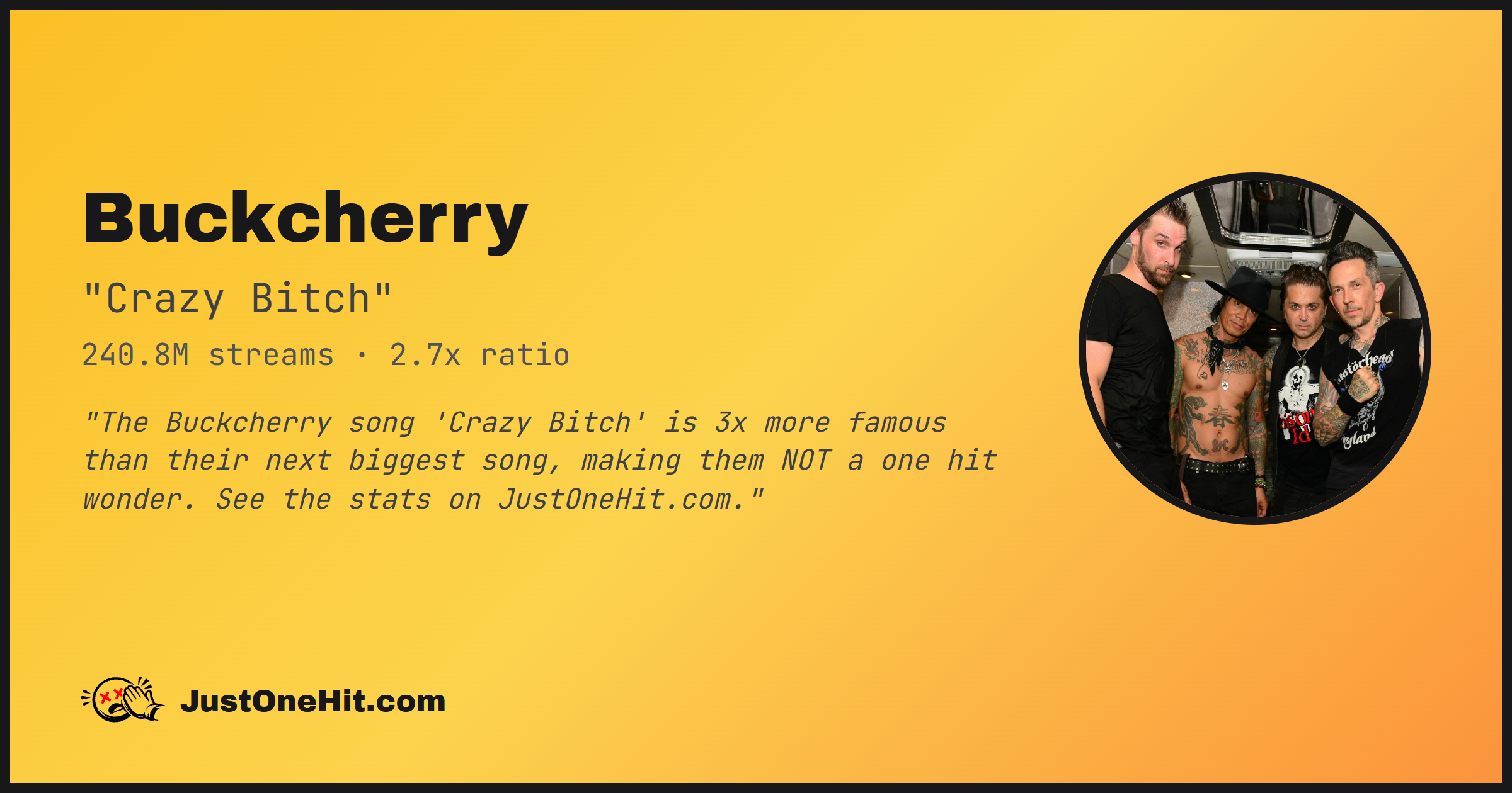 "The Buckcherry song 'Crazy Bitch' is 3x more famous than their next biggest song, making them NOT a one hit wonder. See the stats on JustOneHit.com."
