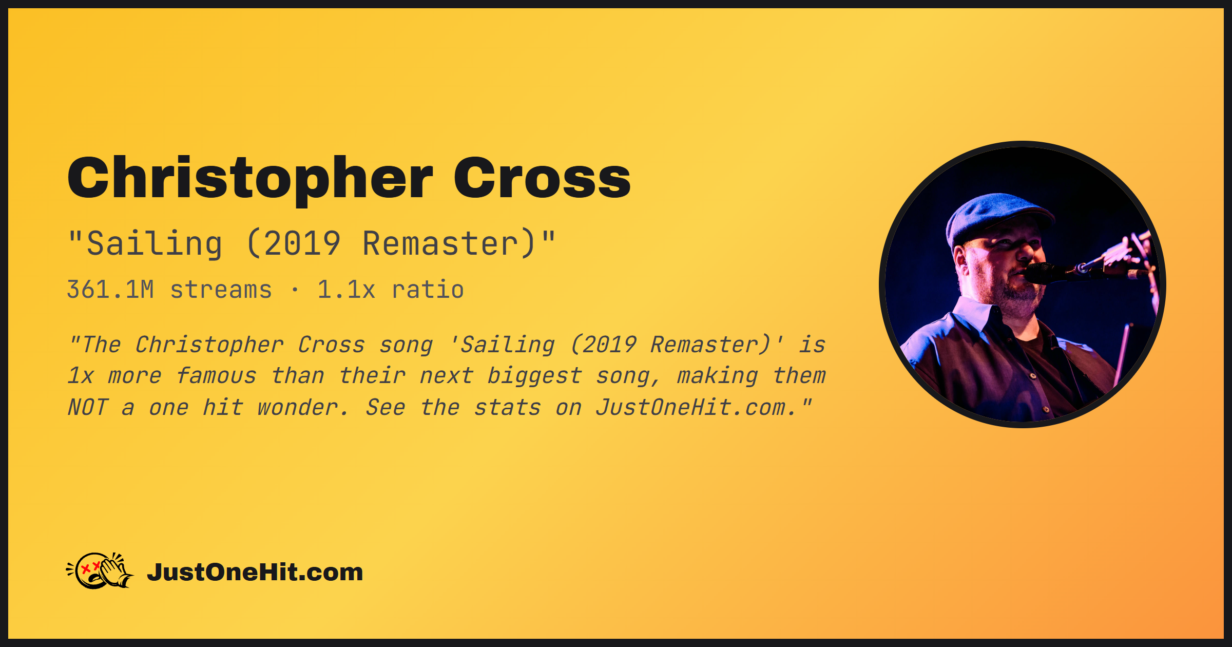 "The Christopher Cross song 'Sailing (2019 Remaster)' is 1x more famous than their next biggest song, making them NOT a one hit wonder. See the stats on JustOneHit.com."