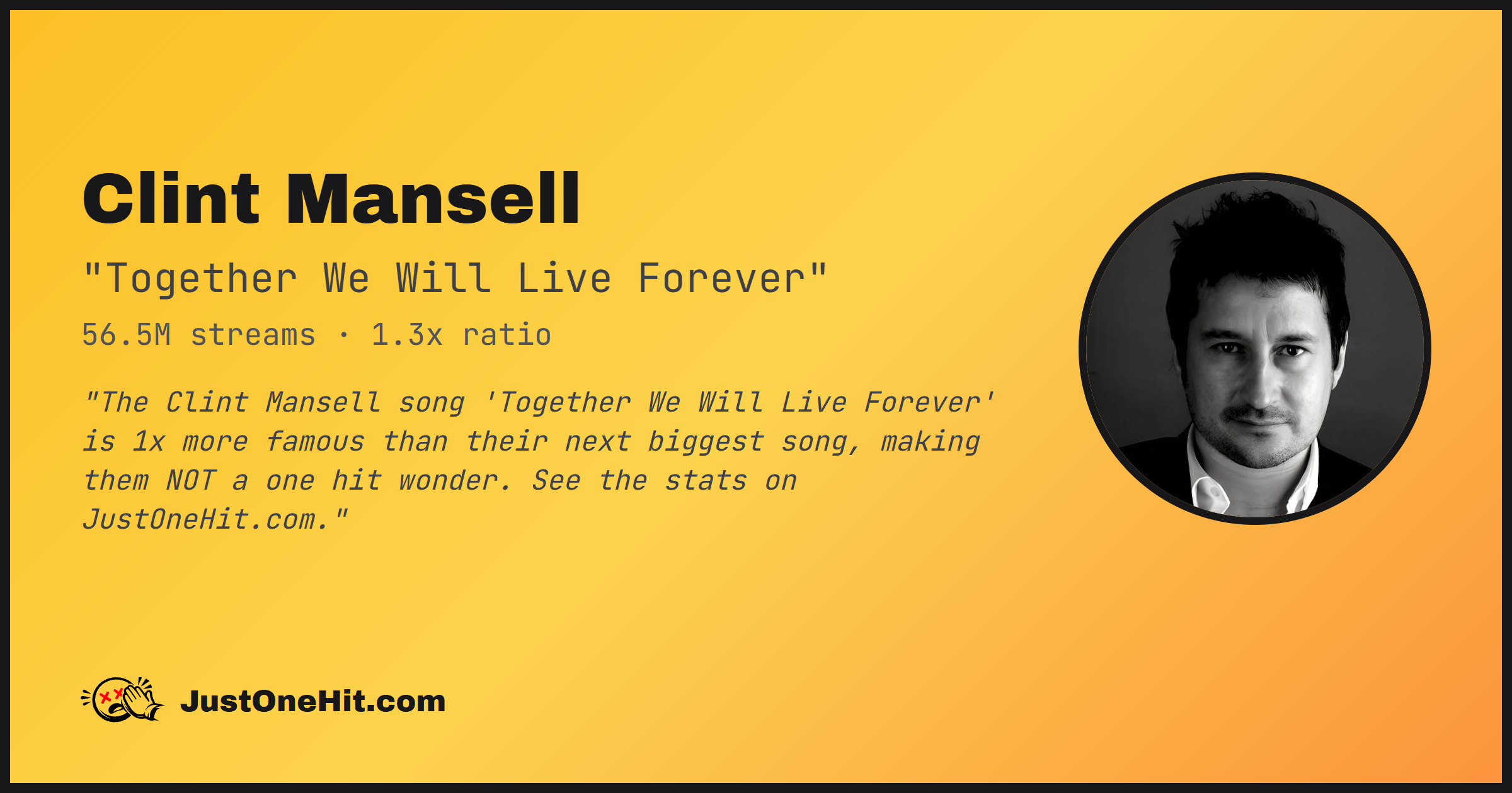 "The Clint Mansell song 'Together We Will Live Forever' is 1x more famous than their next biggest song, making them NOT a one hit wonder. See the stats on JustOneHit.com."