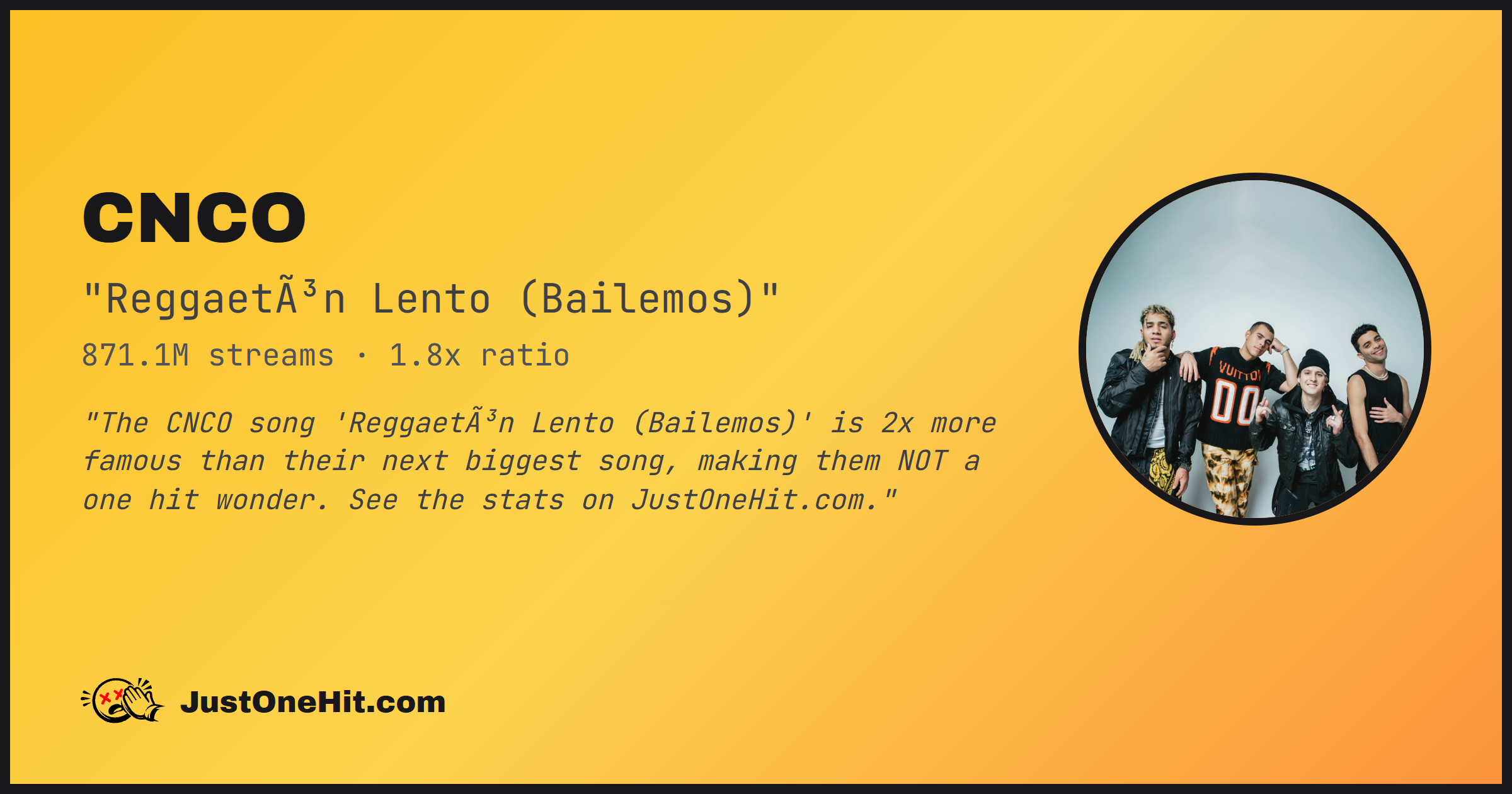 "The CNCO song 'Reggaetón Lento (Bailemos)' is 2x more famous than their next biggest song, making them NOT a one hit wonder. See the stats on JustOneHit.com."