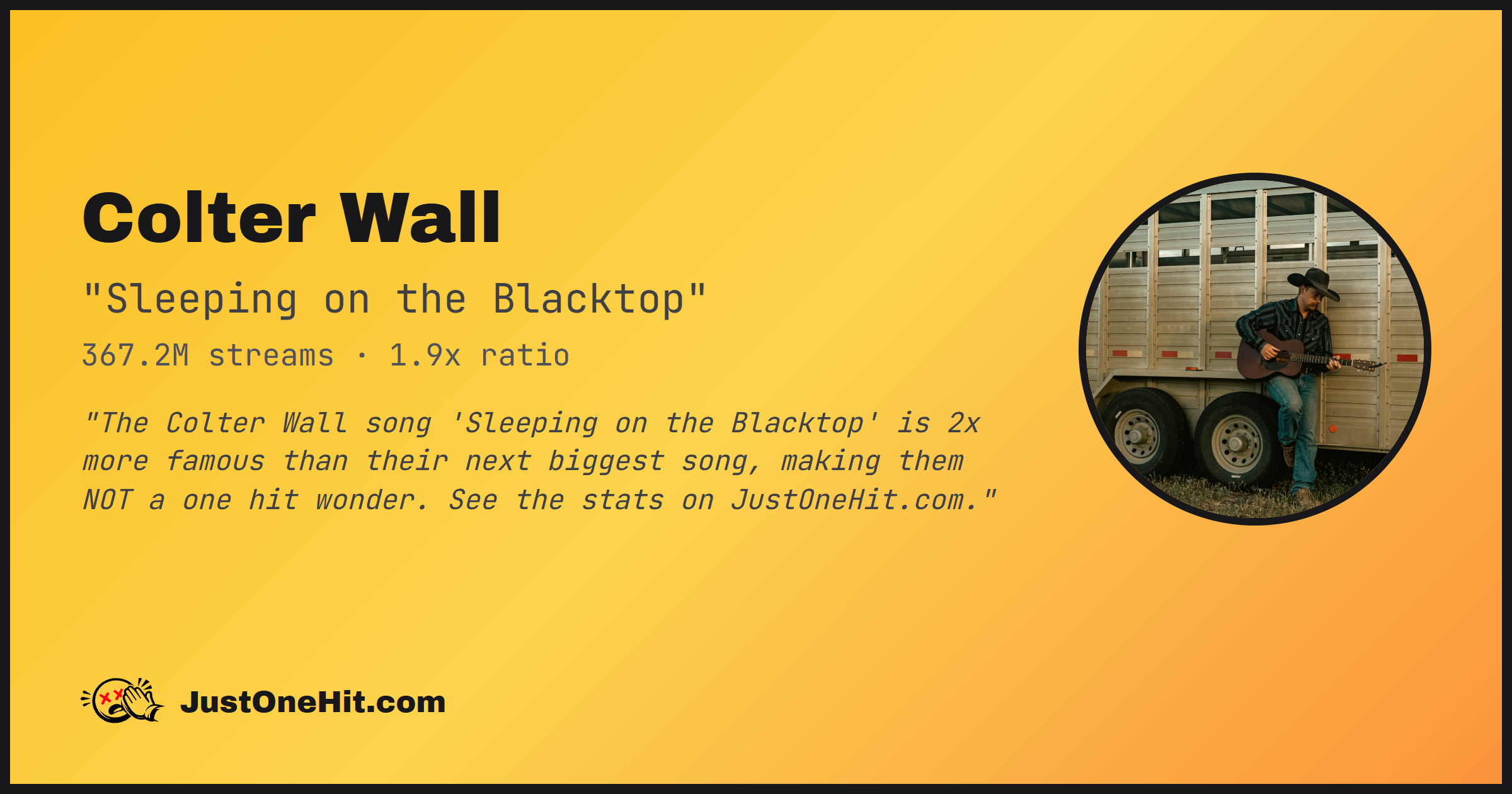 "The Colter Wall song 'Sleeping on the Blacktop' is 2x more famous than their next biggest song, making them NOT a one hit wonder. See the stats on JustOneHit.com."