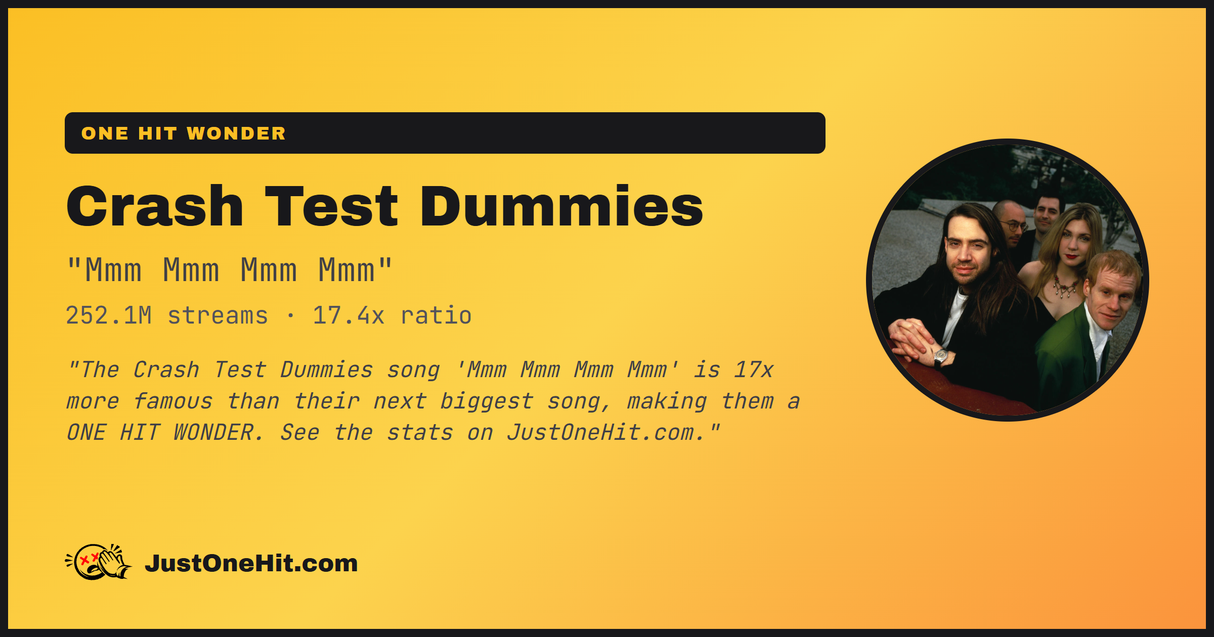 "The Crash Test Dummies song 'Mmm Mmm Mmm Mmm' is 17x more famous than their next biggest song, making them a ONE HIT WONDER. See the stats on JustOneHit.com."