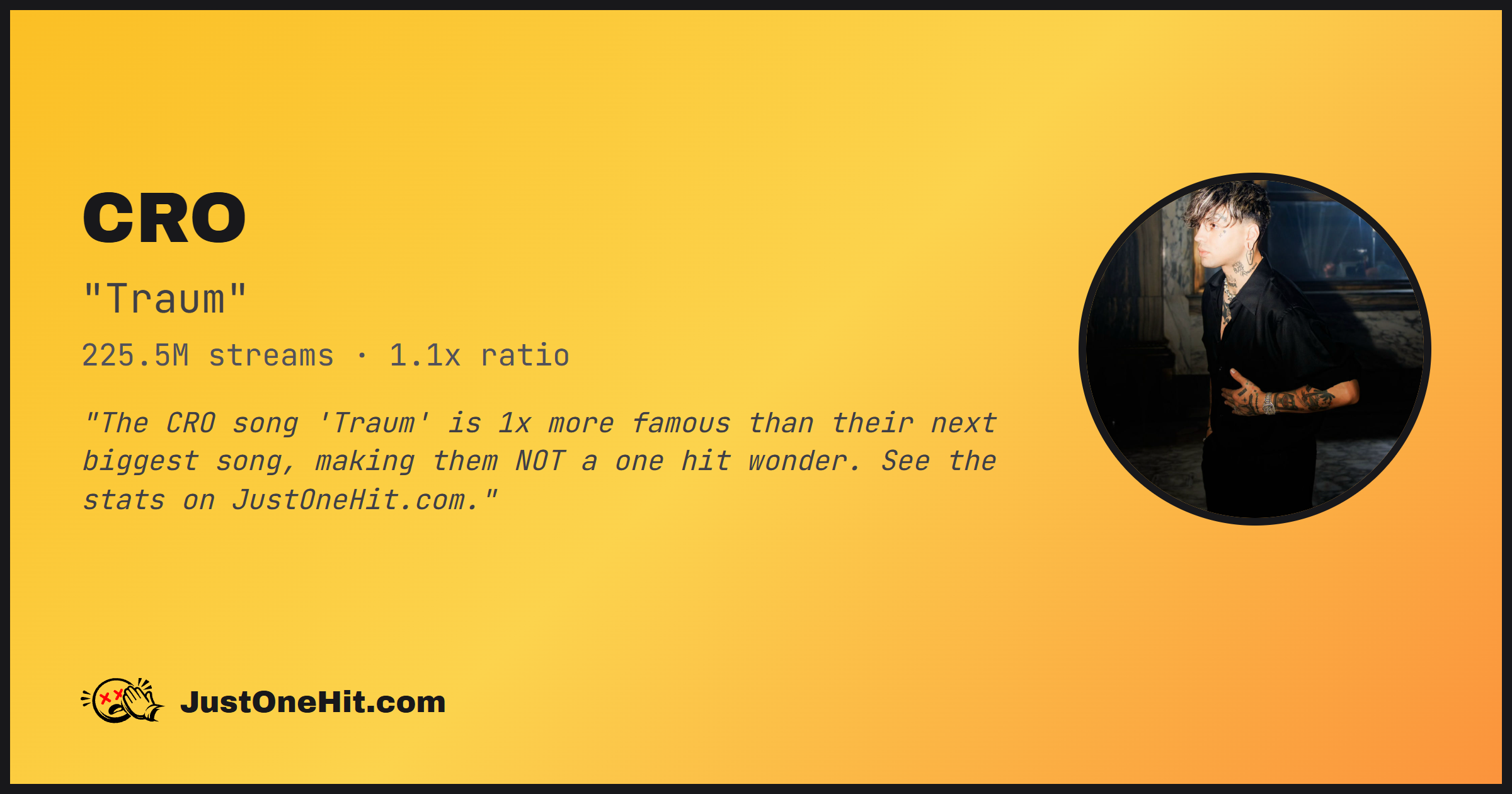 "The CRO song 'Traum' is 1x more famous than their next biggest song, making them NOT a one hit wonder. See the stats on JustOneHit.com."