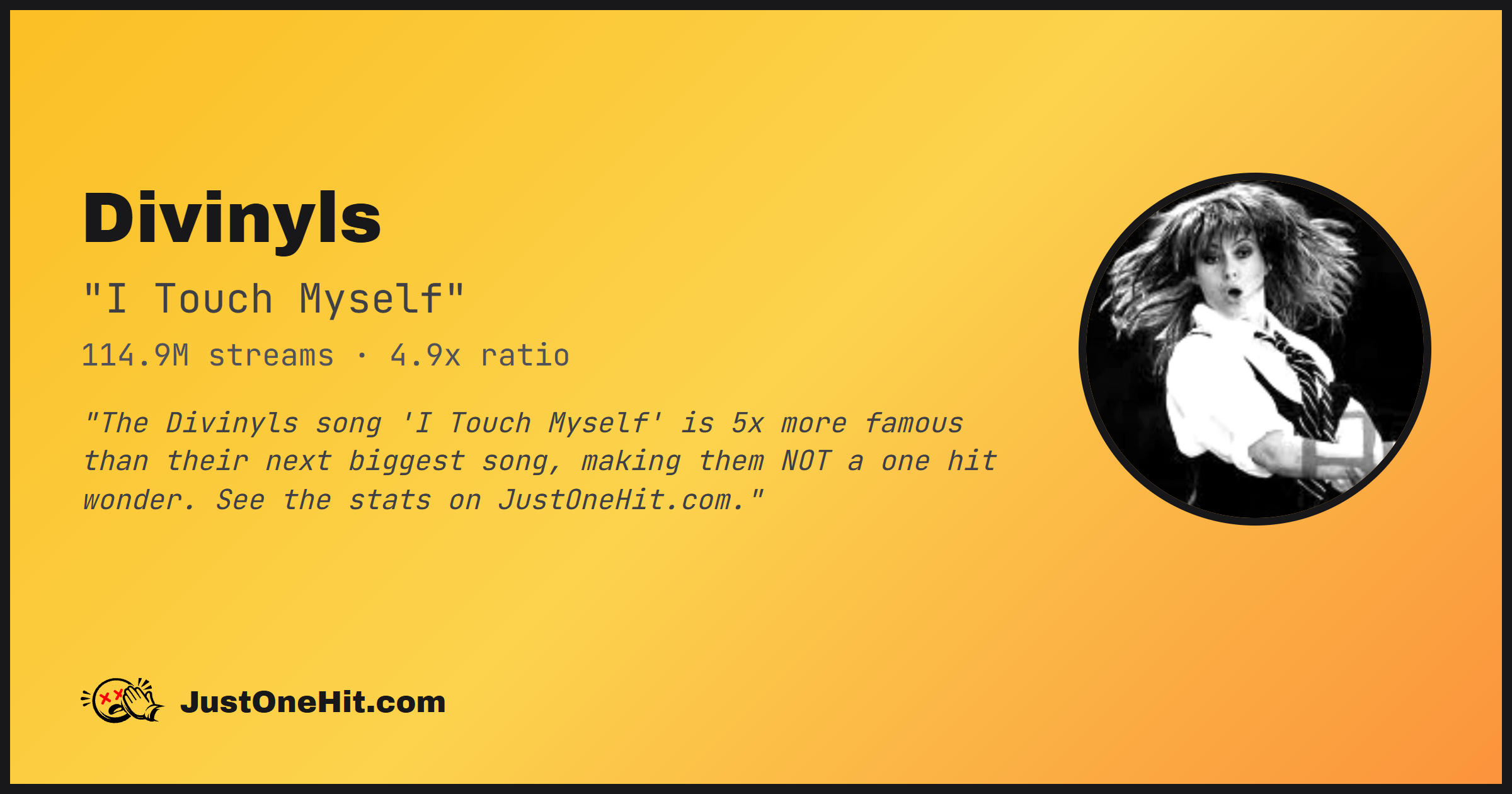 "The Divinyls song 'I Touch Myself' is 5x more famous than their next biggest song, making them NOT a one hit wonder. See the stats on JustOneHit.com."