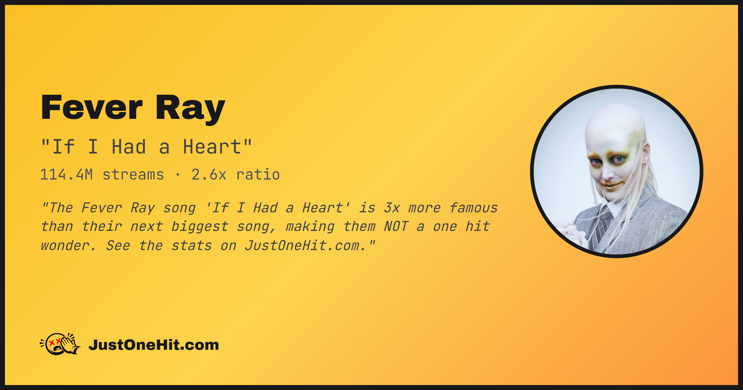 "The Fever Ray song 'If I Had a Heart' is 3x more famous than their next biggest song, making them NOT a one hit wonder. See the stats on JustOneHit.com."