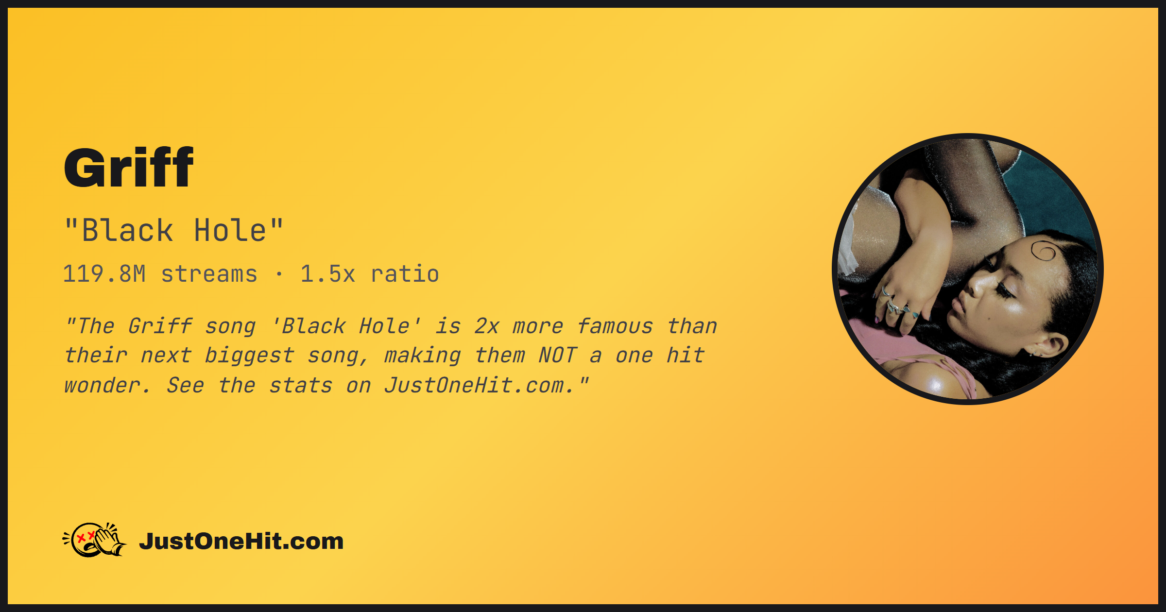 "The Griff song 'Black Hole' is 2x more famous than their next biggest song, making them NOT a one hit wonder. See the stats on JustOneHit.com."