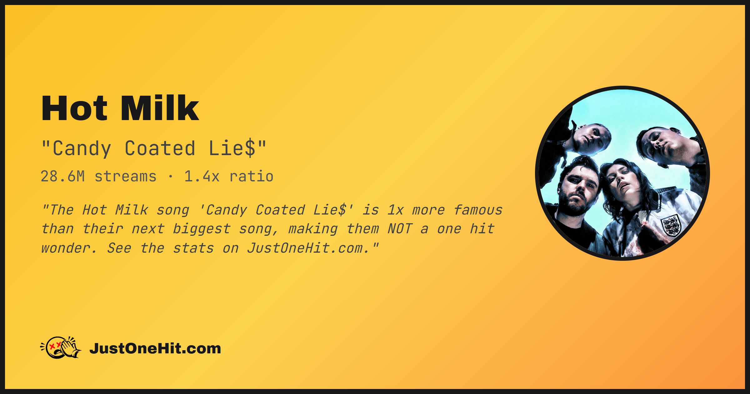 "The Hot Milk song 'Candy Coated Lie$' is 1x more famous than their next biggest song, making them NOT a one hit wonder. See the stats on JustOneHit.com."