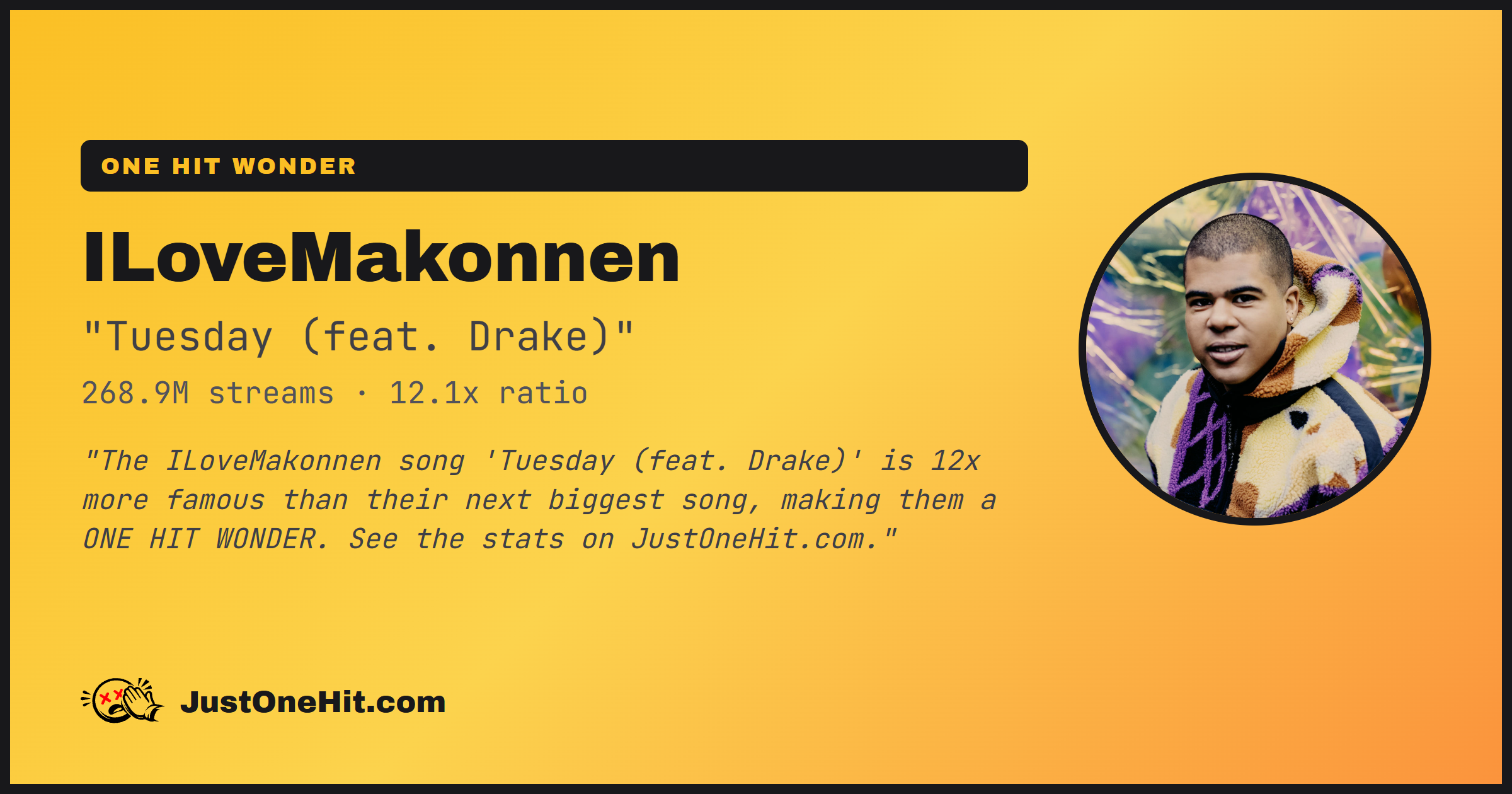"The ILoveMakonnen song 'Tuesday (feat. Drake)' is 12x more famous than their next biggest song, making them a ONE HIT WONDER. See the stats on JustOneHit.com."