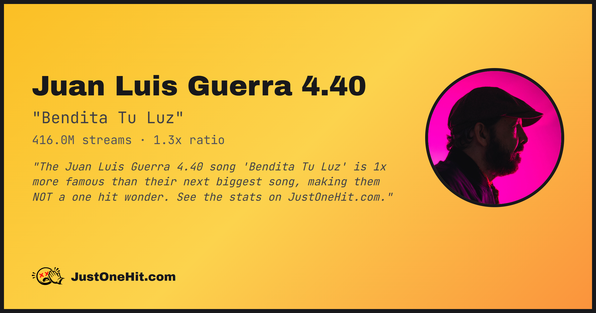 "The Juan Luis Guerra 4.40 song 'Bendita Tu Luz' is 1x more famous than their next biggest song, making them NOT a one hit wonder. See the stats on JustOneHit.com."