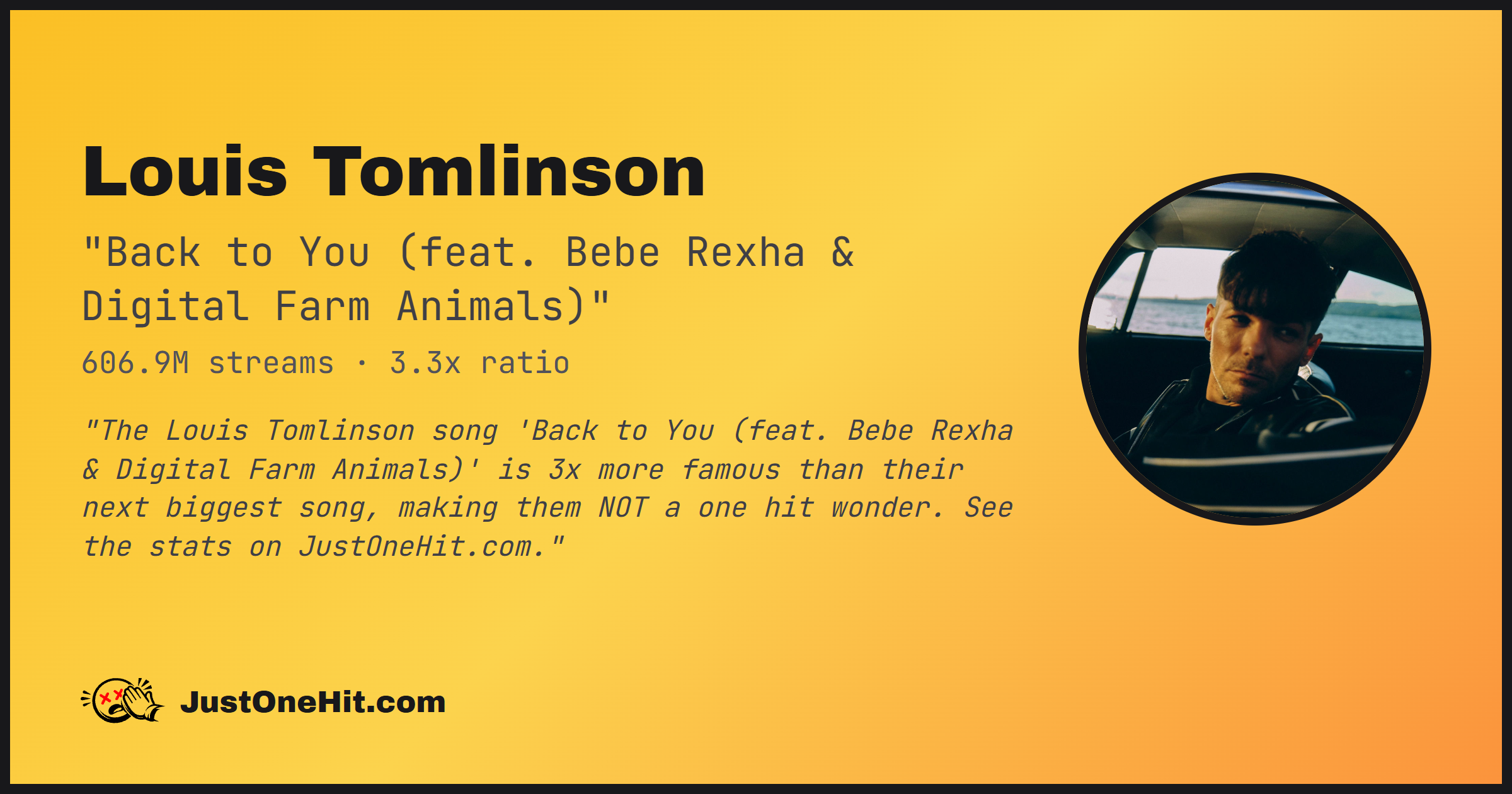"The Louis Tomlinson song 'Back to You (feat. Bebe Rexha & Digital Farm Animals)' is 3x more famous than their next biggest song, making them NOT a one hit wonder. See the stats on JustOneHit.com."