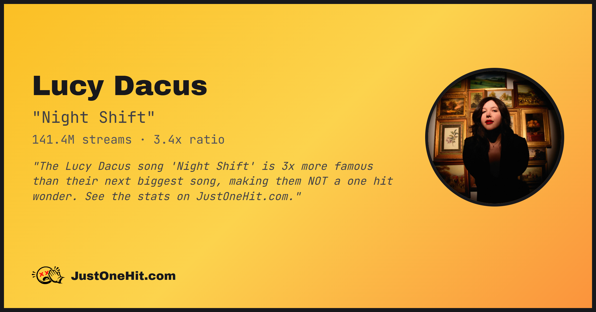 "The Lucy Dacus song 'Night Shift' is 3x more famous than their next biggest song, making them NOT a one hit wonder. See the stats on JustOneHit.com."