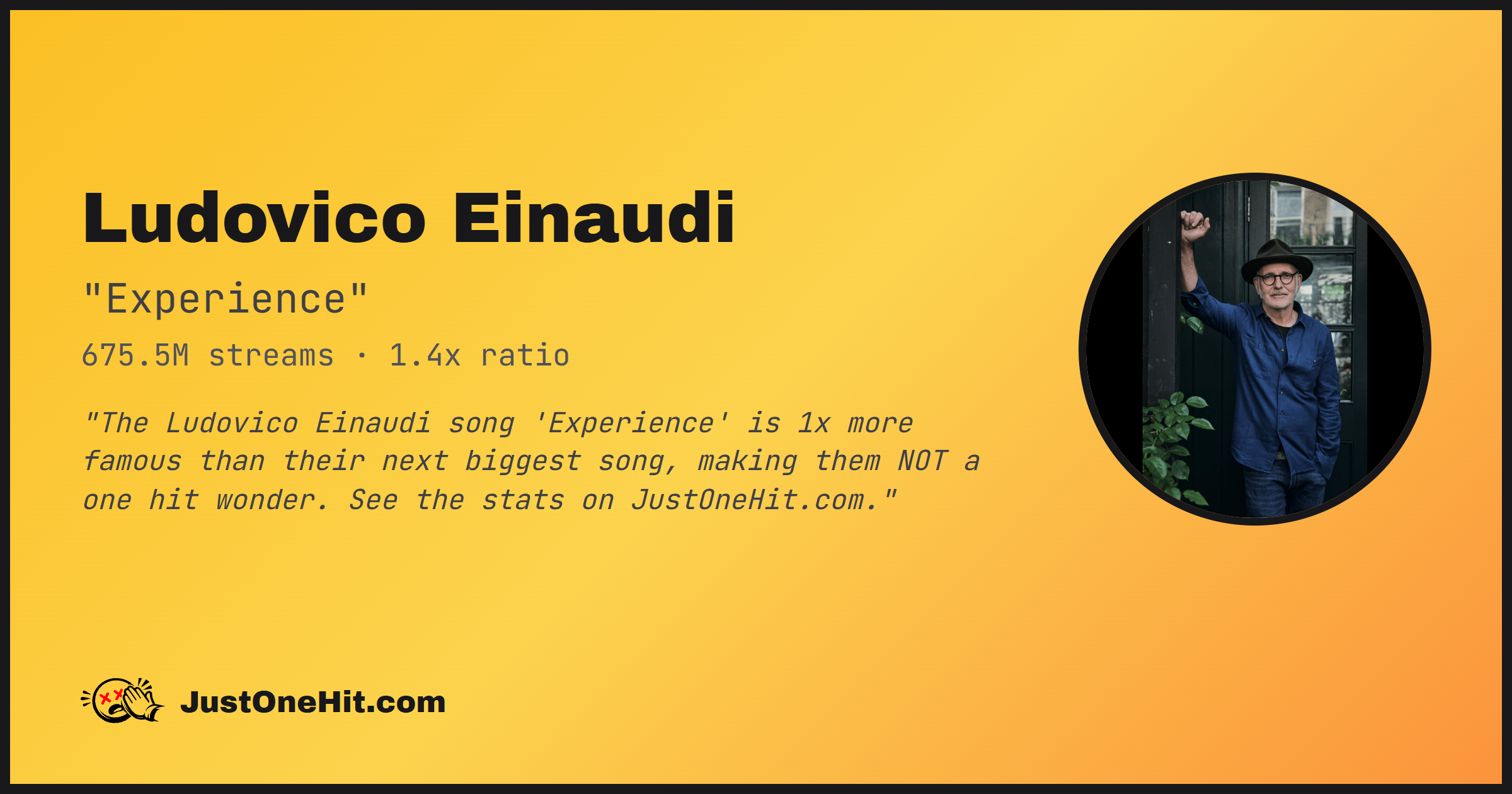 "The Ludovico Einaudi song 'Experience' is 1x more famous than their next biggest song, making them NOT a one hit wonder. See the stats on JustOneHit.com."