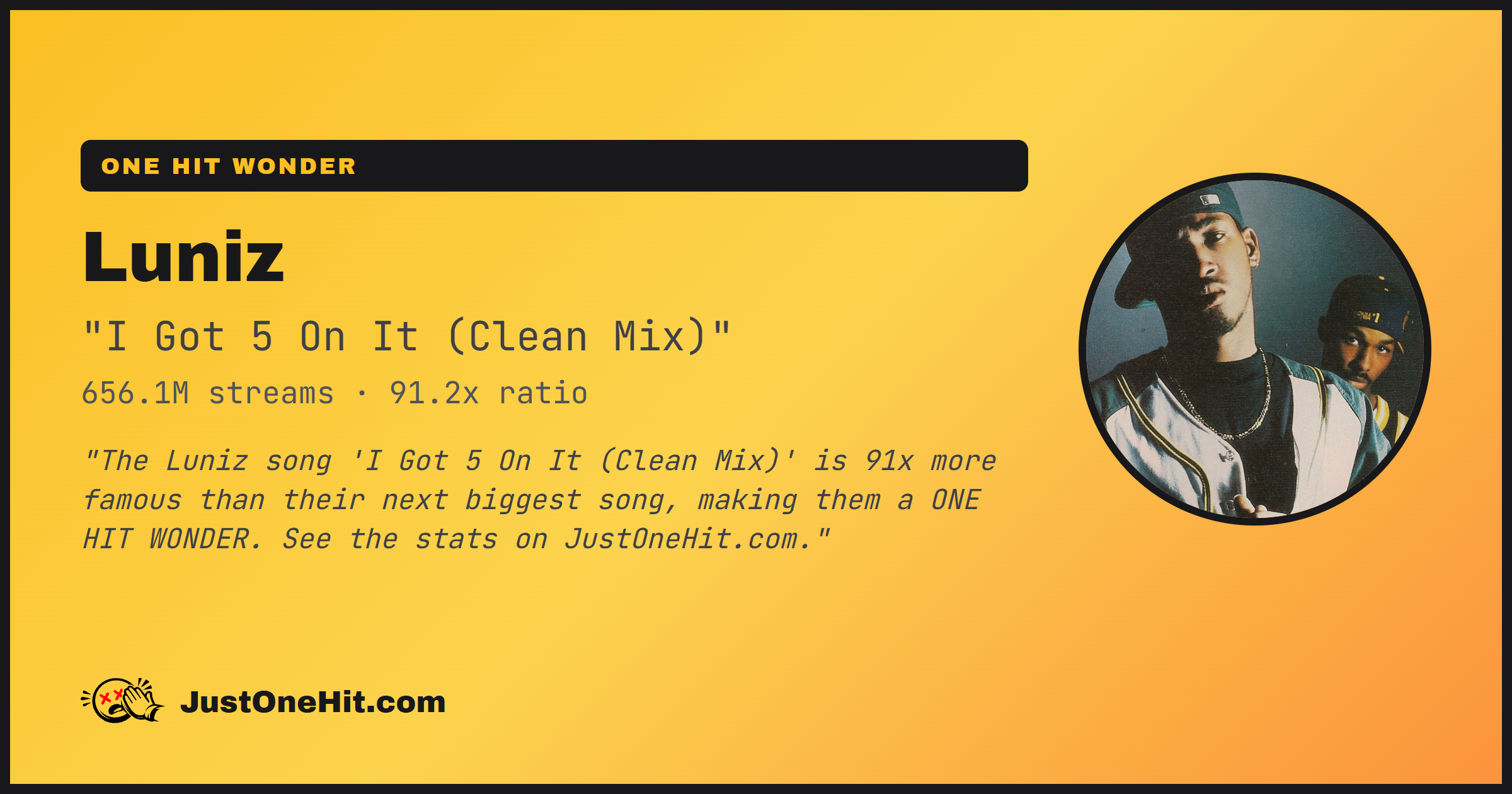 "The Luniz song 'I Got 5 On It (Clean Mix)' is 91x more famous than their next biggest song, making them a ONE HIT WONDER. See the stats on JustOneHit.com."
