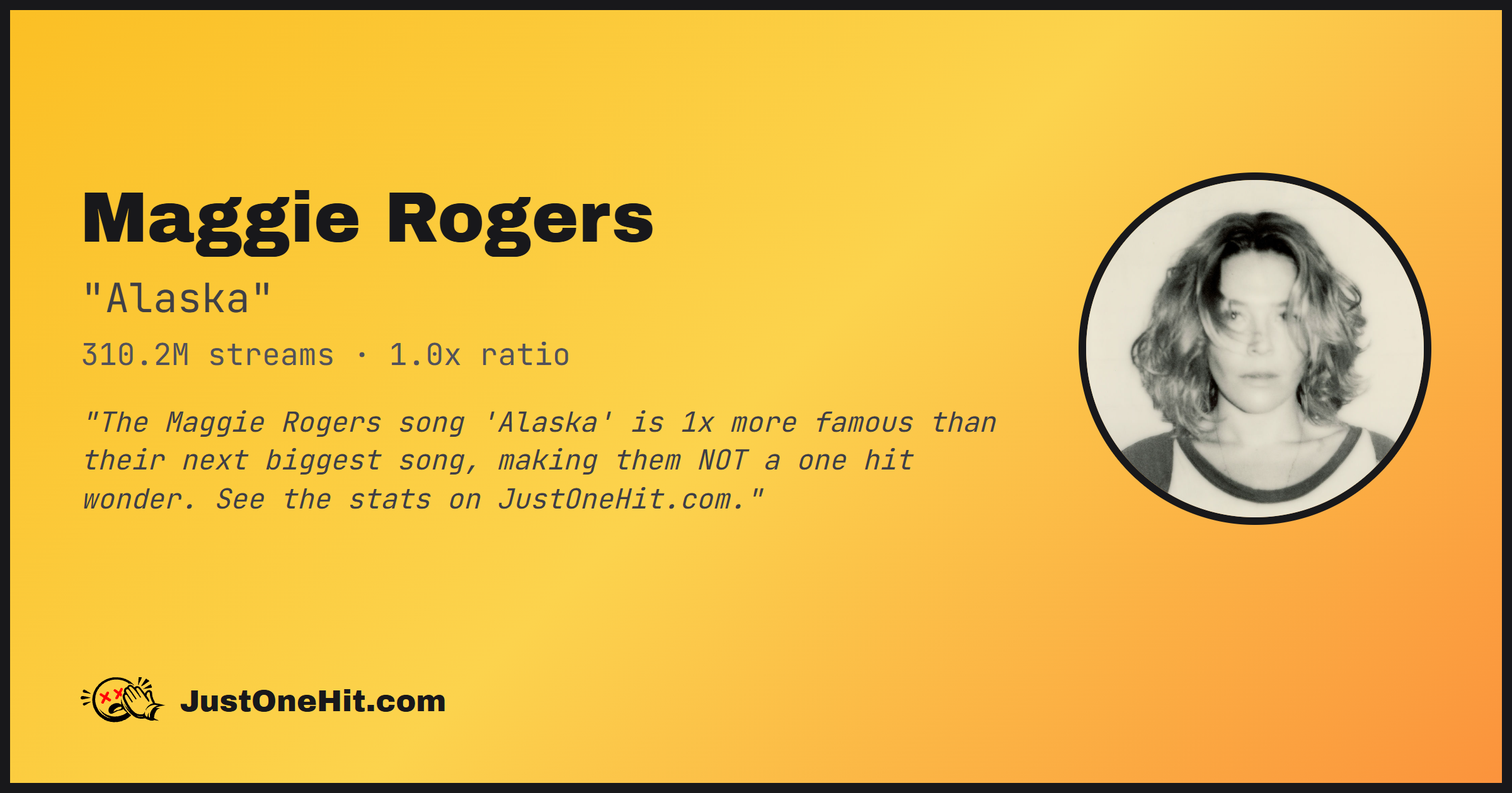 "The Maggie Rogers song 'Alaska' is 1x more famous than their next biggest song, making them NOT a one hit wonder. See the stats on JustOneHit.com."