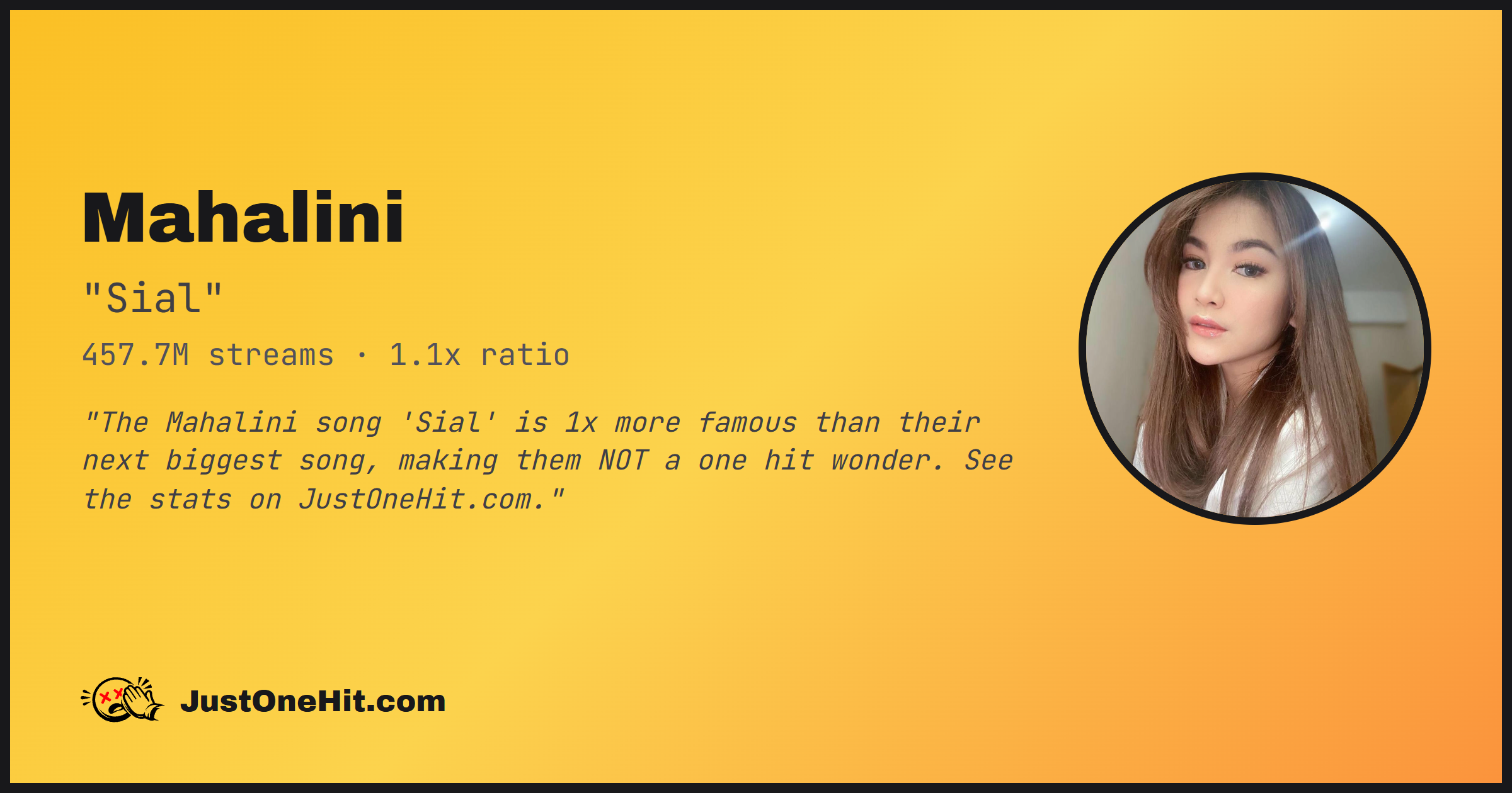 "The Mahalini song 'Sial' is 1x more famous than their next biggest song, making them NOT a one hit wonder. See the stats on JustOneHit.com."