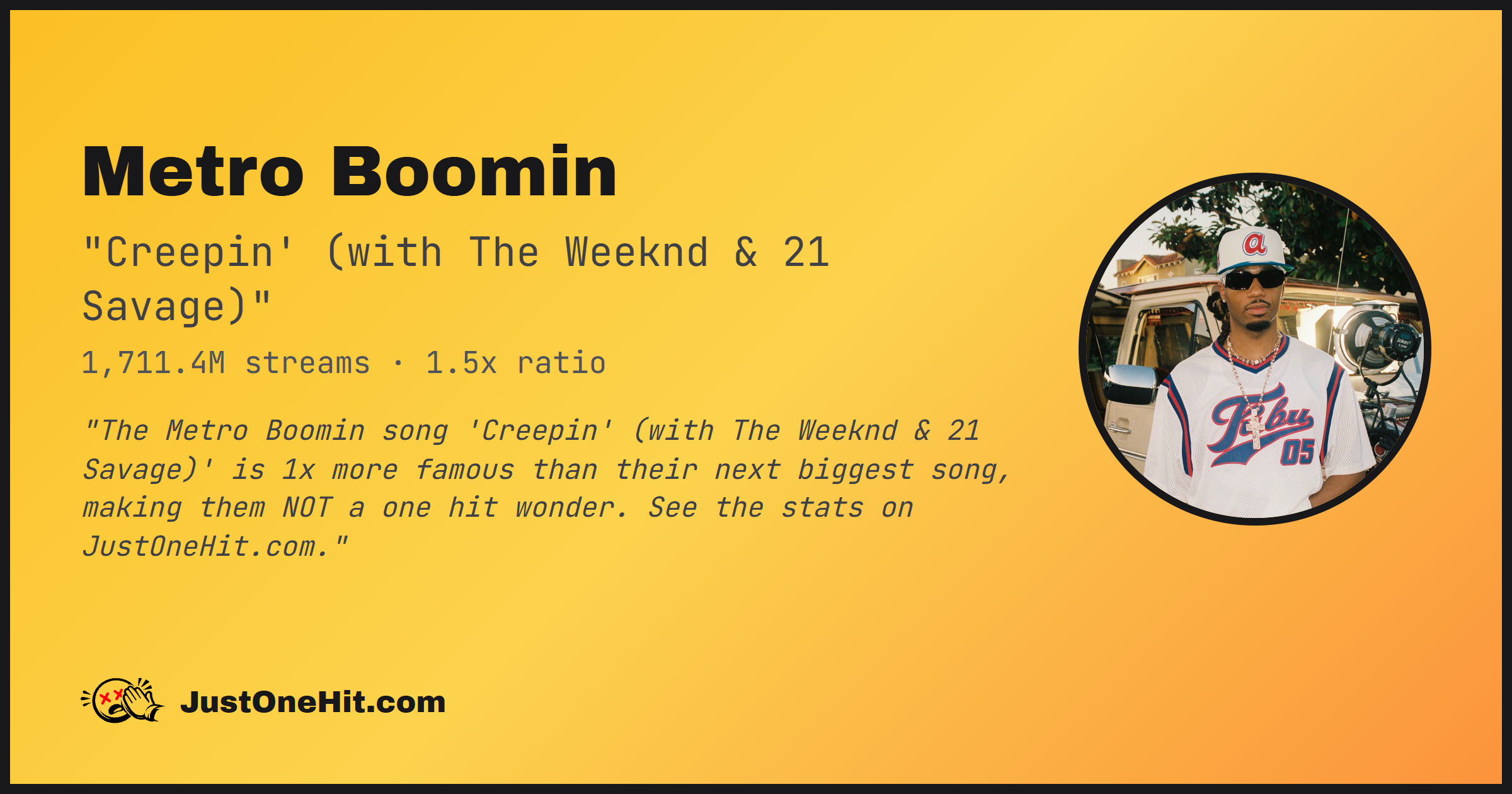 "The Metro Boomin song 'Creepin' (with The Weeknd & 21 Savage)' is 1x more famous than their next biggest song, making them NOT a one hit wonder. See the stats on JustOneHit.com."