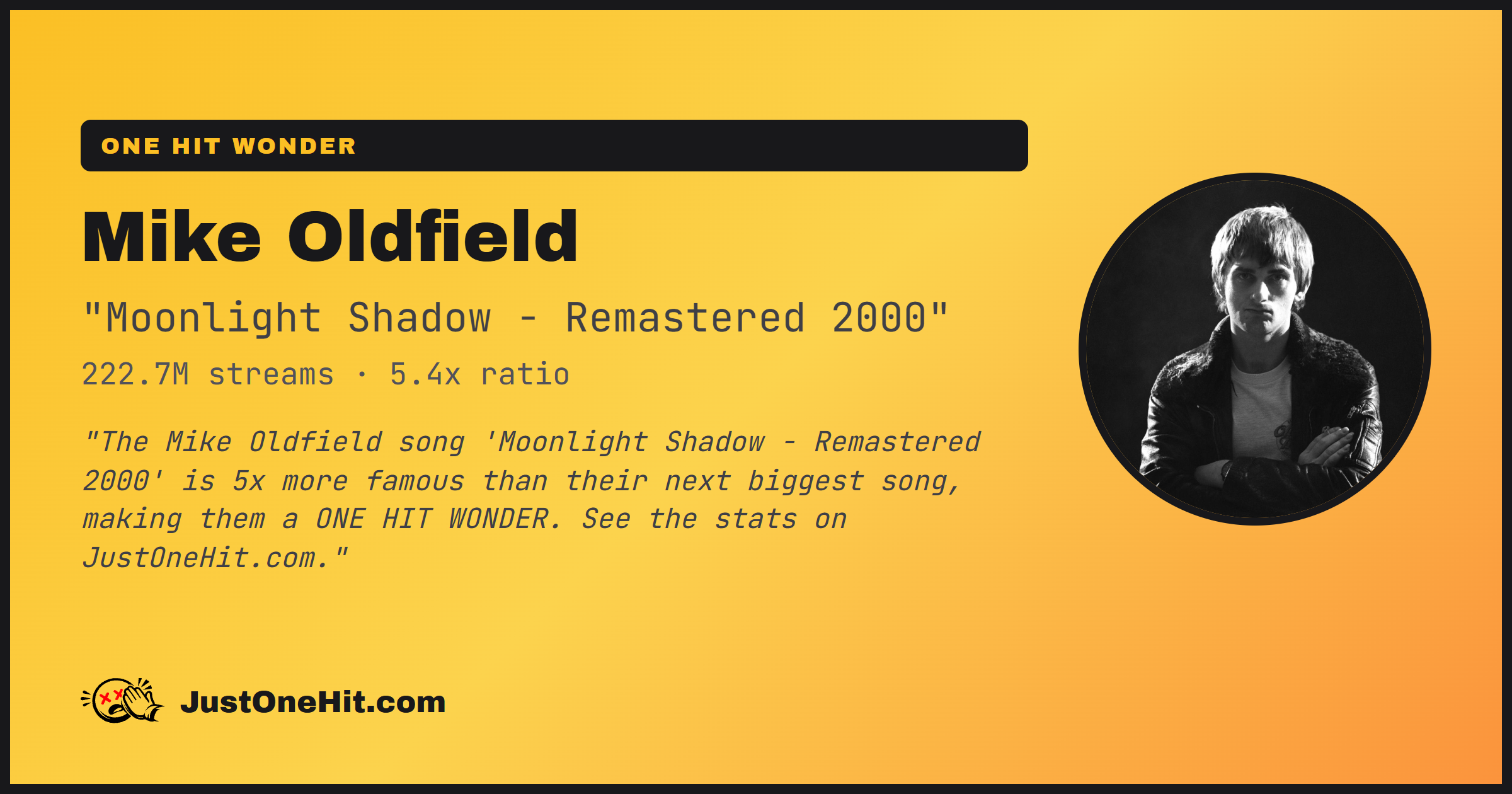 "The Mike Oldfield song 'Moonlight Shadow - Remastered 2000' is 5x more famous than their next biggest song, making them a ONE HIT WONDER. See the stats on JustOneHit.com."