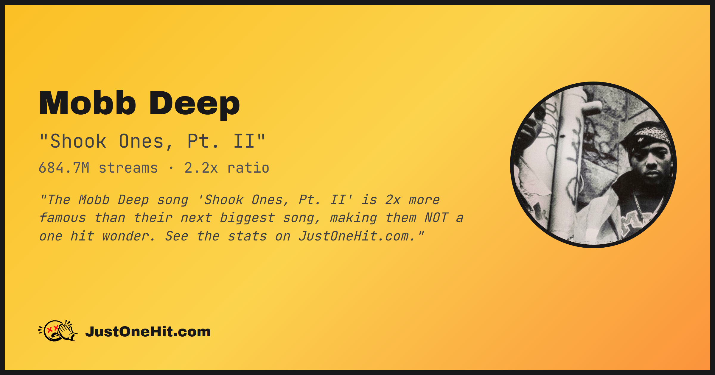 "The Mobb Deep song 'Shook Ones, Pt. II' is 2x more famous than their next biggest song, making them NOT a one hit wonder. See the stats on JustOneHit.com."