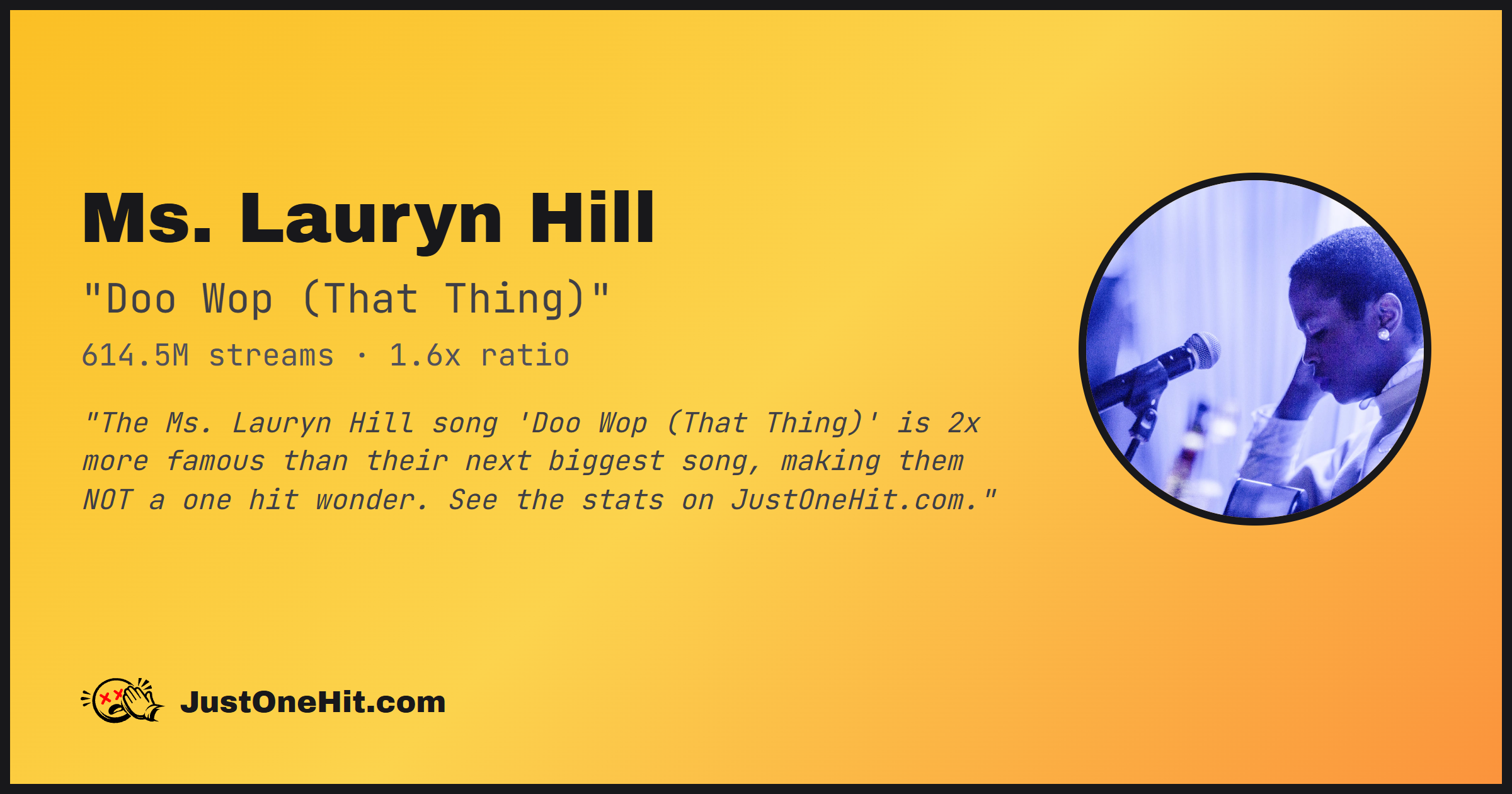 "The Ms. Lauryn Hill song 'Doo Wop (That Thing)' is 2x more famous than their next biggest song, making them NOT a one hit wonder. See the stats on JustOneHit.com."