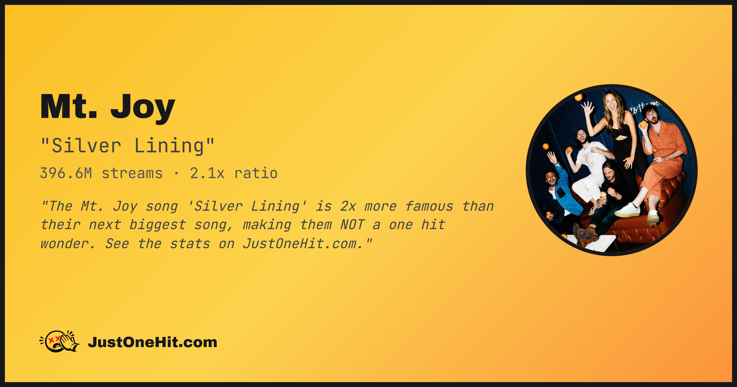 "The Mt. Joy song 'Silver Lining' is 2x more famous than their next biggest song, making them NOT a one hit wonder. See the stats on JustOneHit.com."