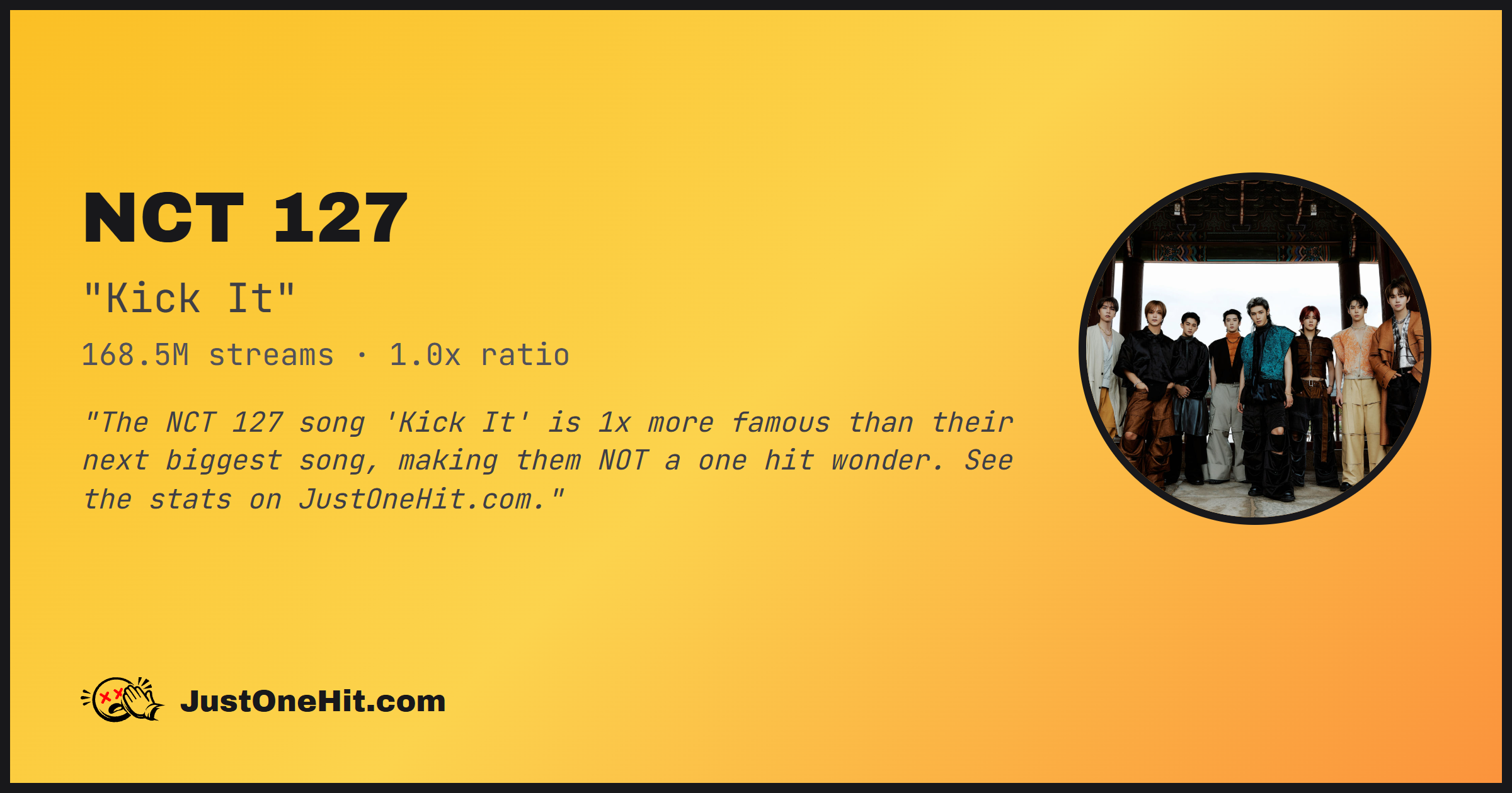 "The NCT 127 song 'Kick It' is 1x more famous than their next biggest song, making them NOT a one hit wonder. See the stats on JustOneHit.com."