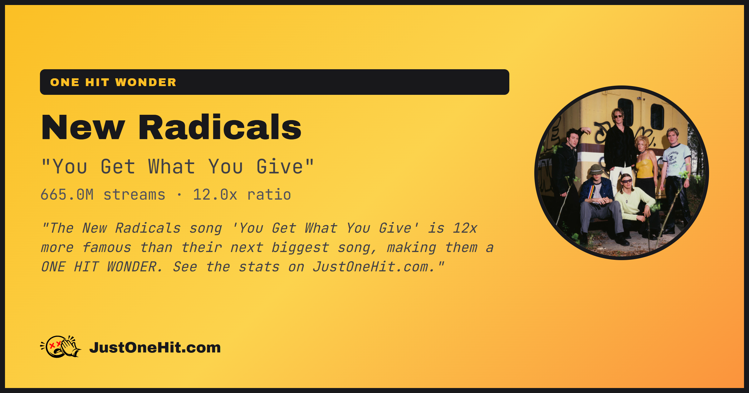 "The New Radicals song 'You Get What You Give' is 12x more famous than their next biggest song, making them a ONE HIT WONDER. See the stats on JustOneHit.com."