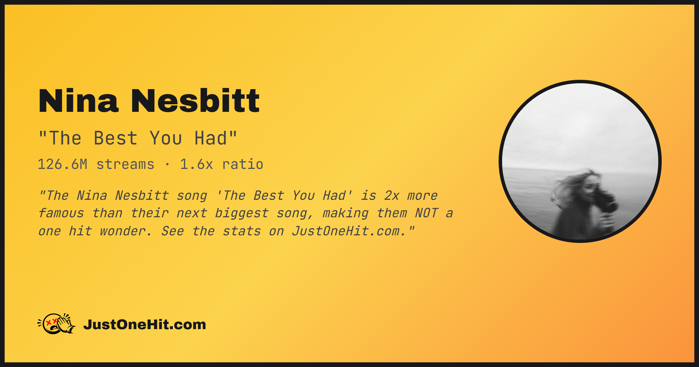 "The Nina Nesbitt song 'The Best You Had' is 2x more famous than their next biggest song, making them NOT a one hit wonder. See the stats on JustOneHit.com."