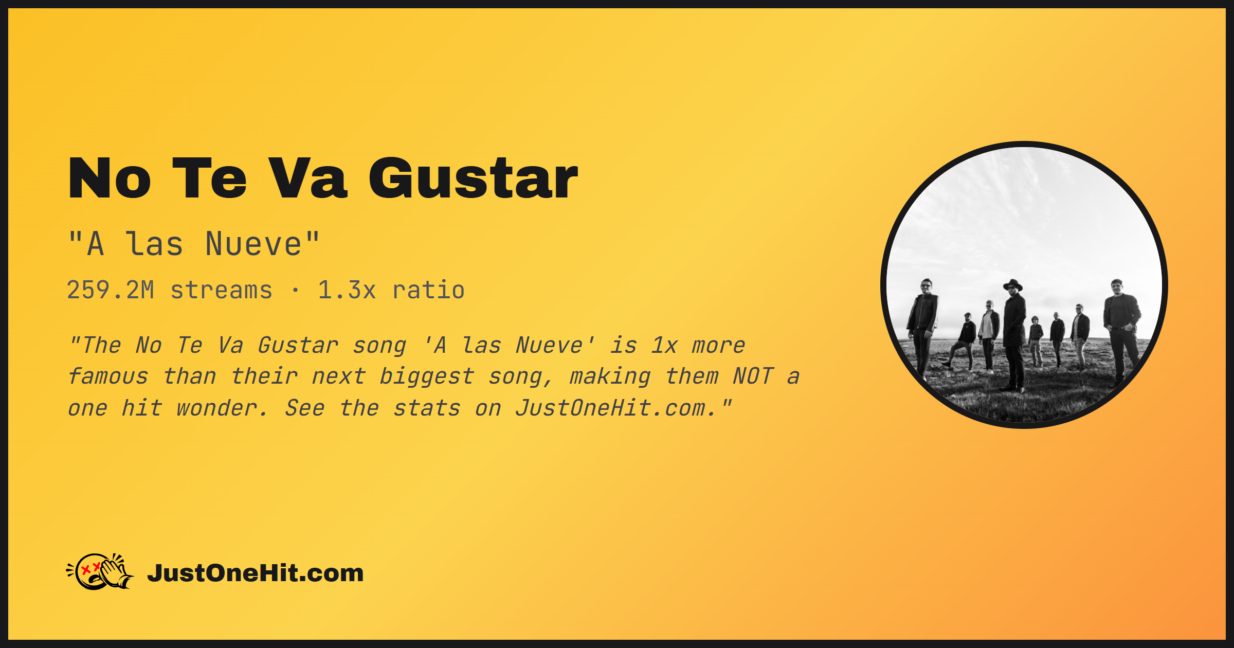 "The No Te Va Gustar song 'A las Nueve' is 1x more famous than their next biggest song, making them NOT a one hit wonder. See the stats on JustOneHit.com."
