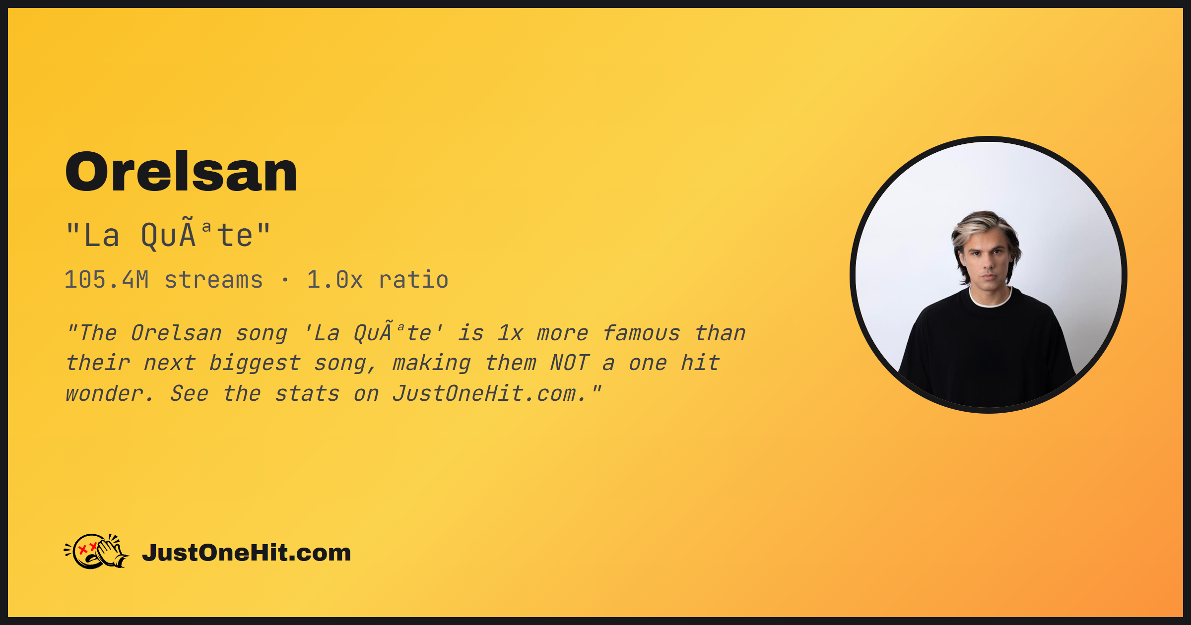 "The Orelsan song 'La Quête' is 1x more famous than their next biggest song, making them NOT a one hit wonder. See the stats on JustOneHit.com."