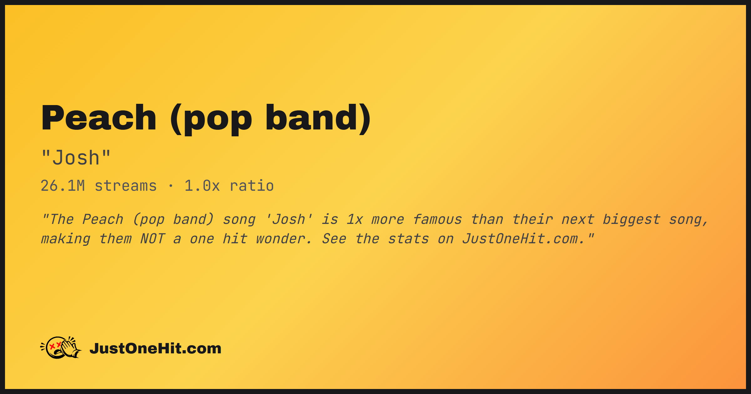 "The Peach (pop band) song 'Josh' is 1x more famous than their next biggest song, making them NOT a one hit wonder. See the stats on JustOneHit.com."