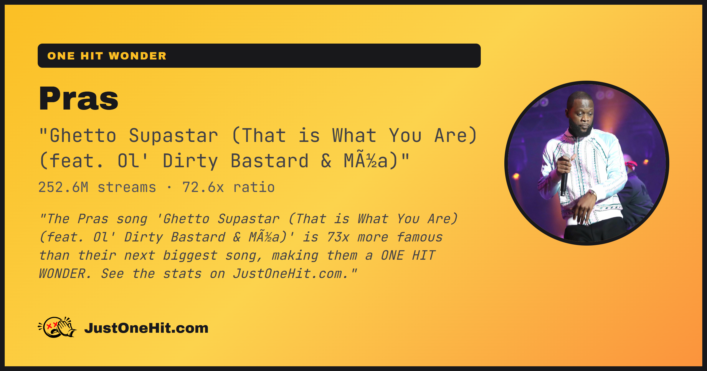 "The Pras song 'Ghetto Supastar (That is What You Are) (feat. Ol' Dirty Bastard & Mýa)' is 73x more famous than their next biggest song, making them a ONE HIT WONDER. See the stats on JustOneHit.com."