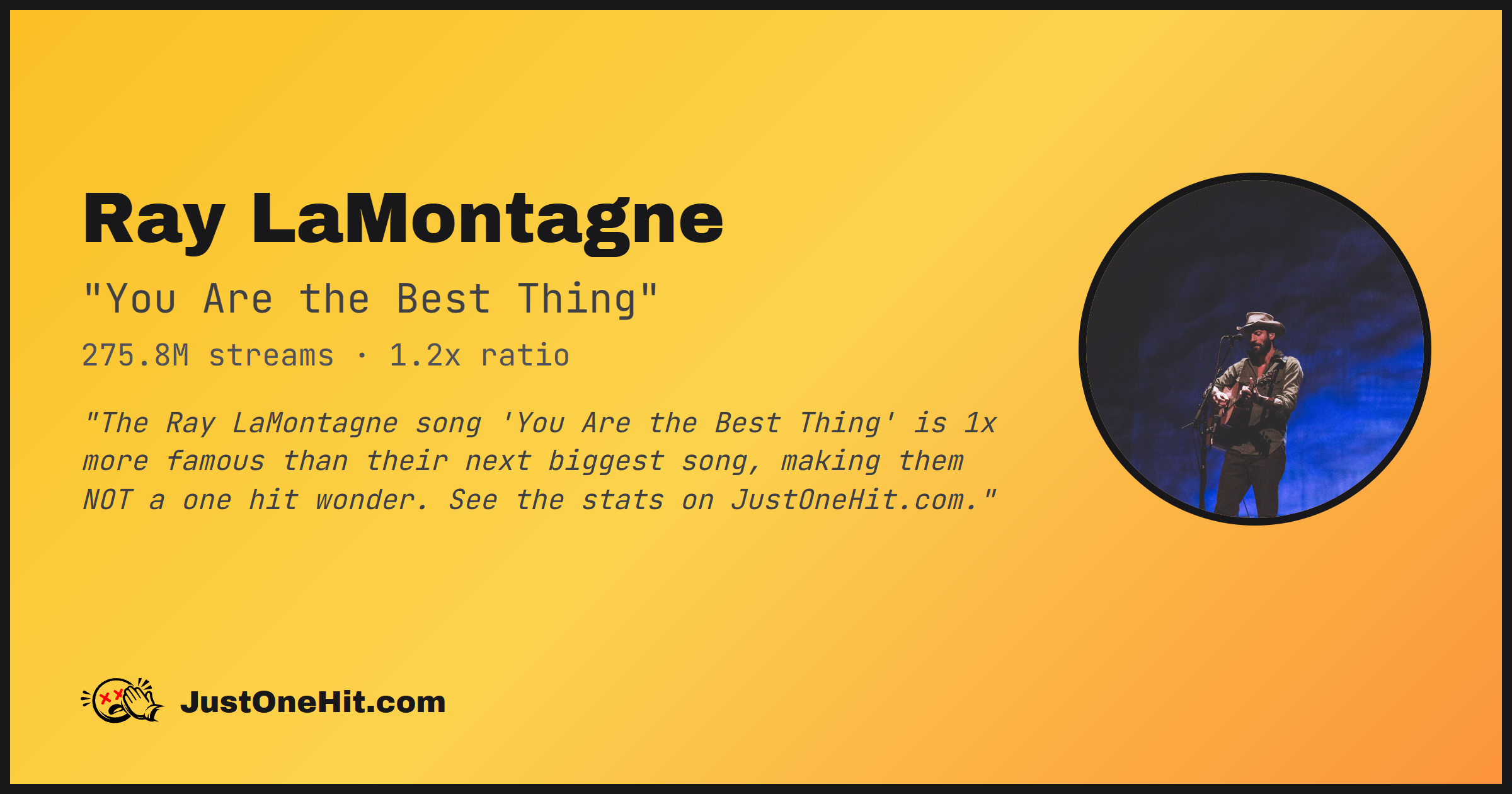 "The Ray LaMontagne song 'You Are the Best Thing' is 1x more famous than their next biggest song, making them NOT a one hit wonder. See the stats on JustOneHit.com."