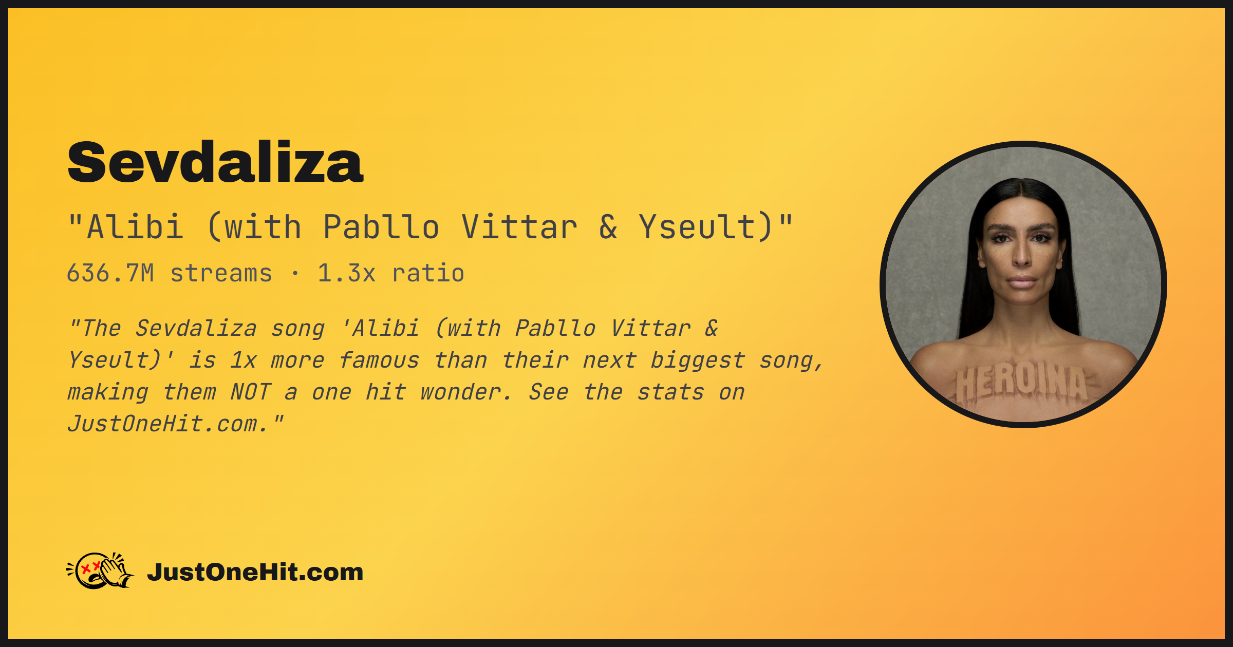 "The Sevdaliza song 'Alibi (with Pabllo Vittar & Yseult)' is 1x more famous than their next biggest song, making them NOT a one hit wonder. See the stats on JustOneHit.com."