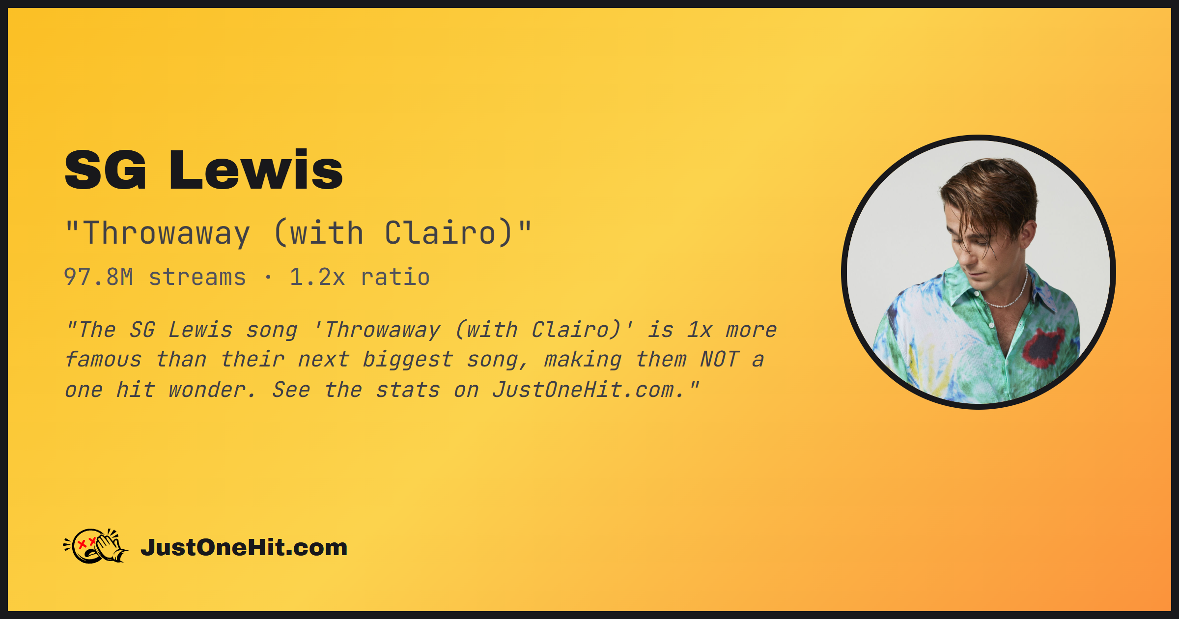 "The SG Lewis song 'Throwaway (with Clairo)' is 1x more famous than their next biggest song, making them NOT a one hit wonder. See the stats on JustOneHit.com."