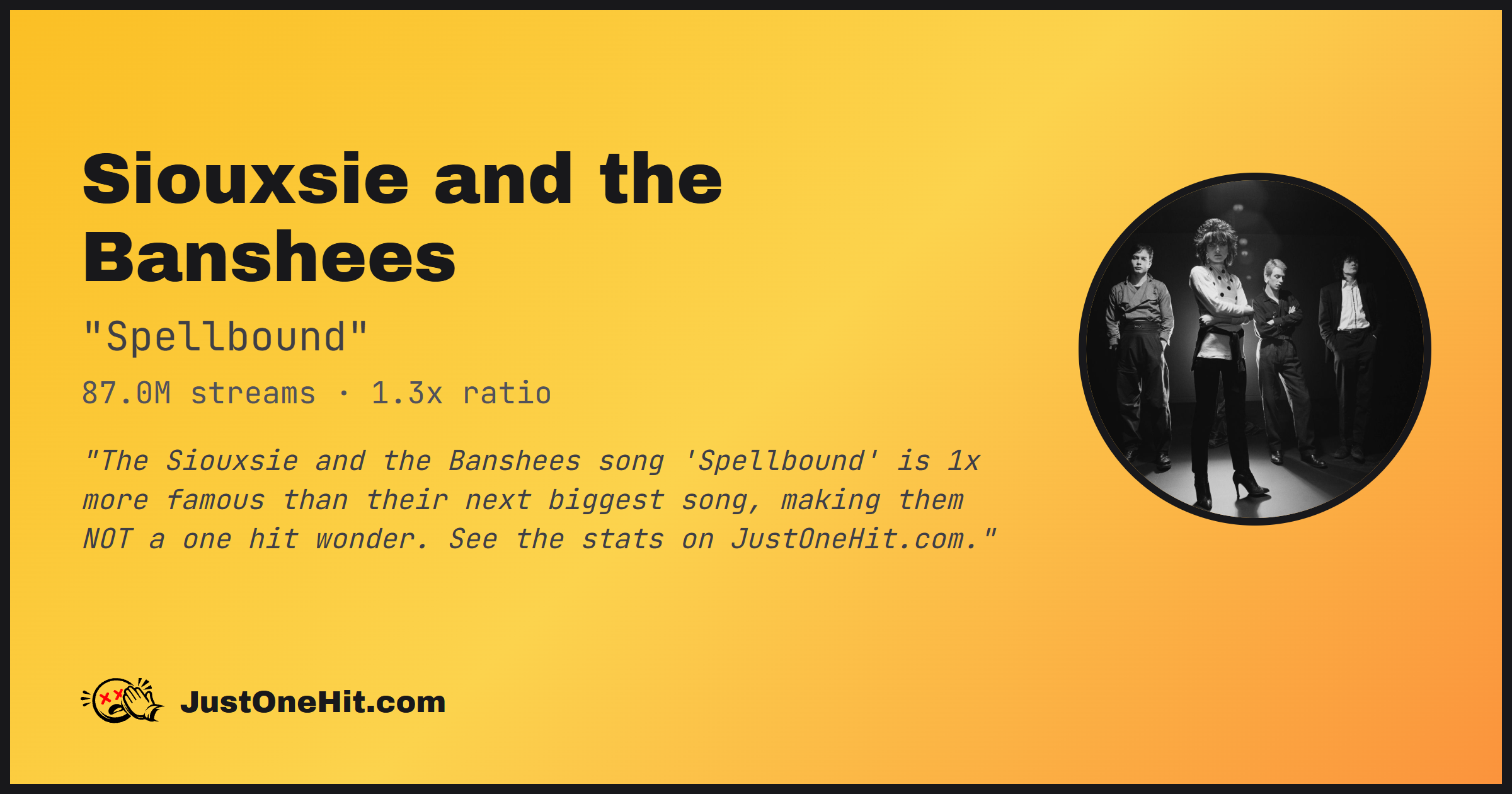 "The Siouxsie and the Banshees song 'Spellbound' is 1x more famous than their next biggest song, making them NOT a one hit wonder. See the stats on JustOneHit.com."