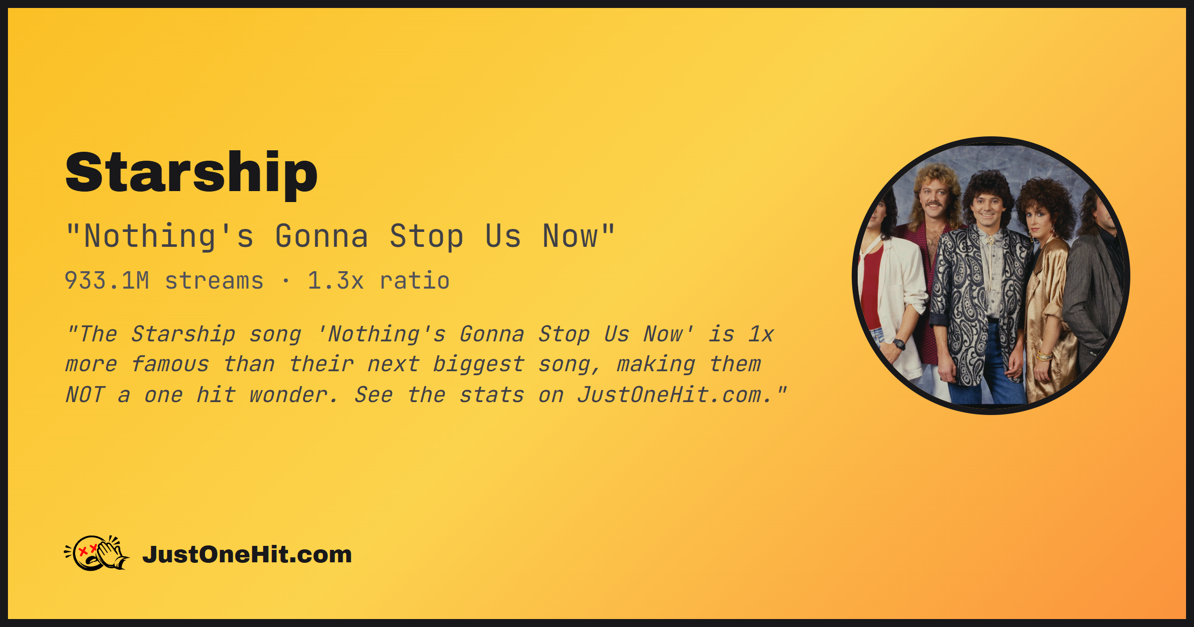 "The Starship song 'Nothing's Gonna Stop Us Now' is 1x more famous than their next biggest song, making them NOT a one hit wonder. See the stats on JustOneHit.com."