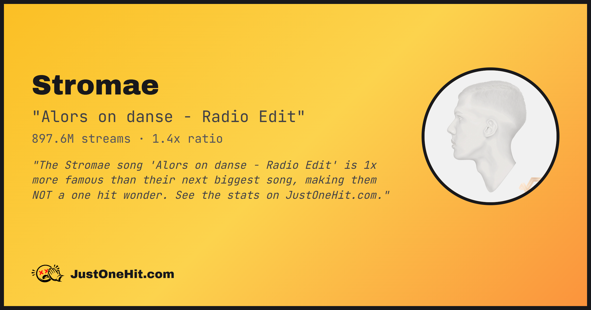 "The Stromae song 'Alors on danse - Radio Edit' is 1x more famous than their next biggest song, making them NOT a one hit wonder. See the stats on JustOneHit.com."