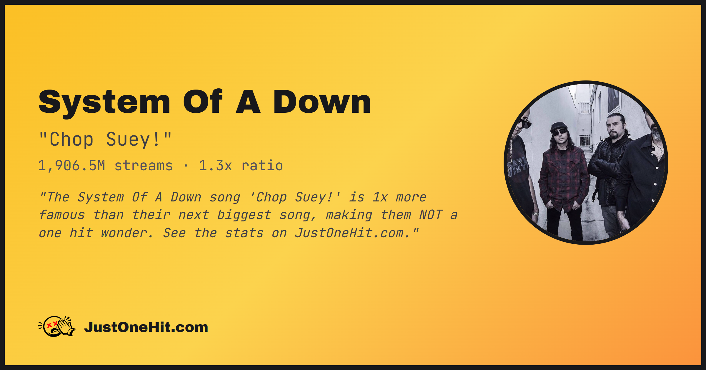 "The System Of A Down song 'Chop Suey!' is 1x more famous than their next biggest song, making them NOT a one hit wonder. See the stats on JustOneHit.com."