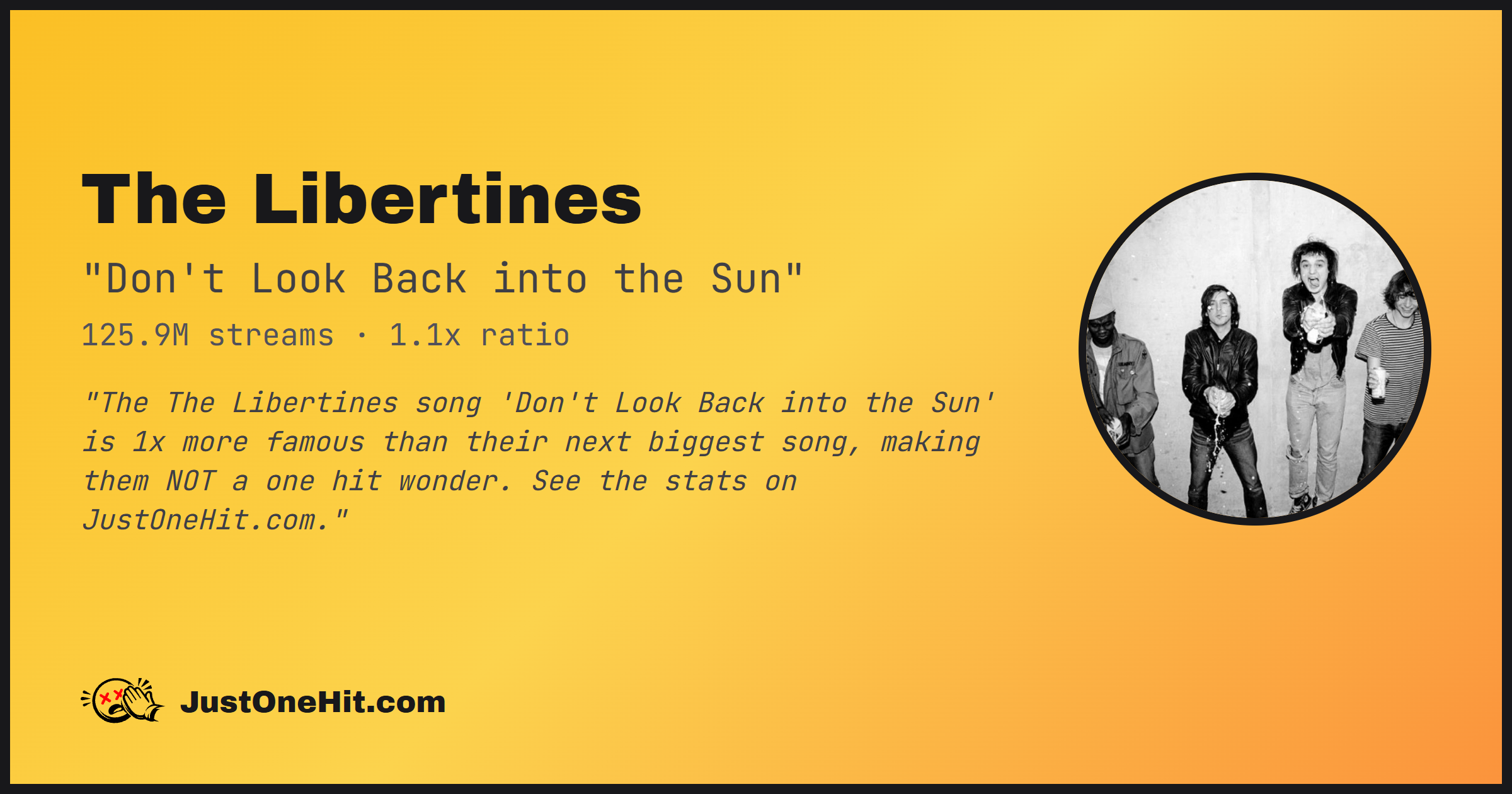 "The The Libertines song 'Don't Look Back into the Sun' is 1x more famous than their next biggest song, making them NOT a one hit wonder. See the stats on JustOneHit.com."