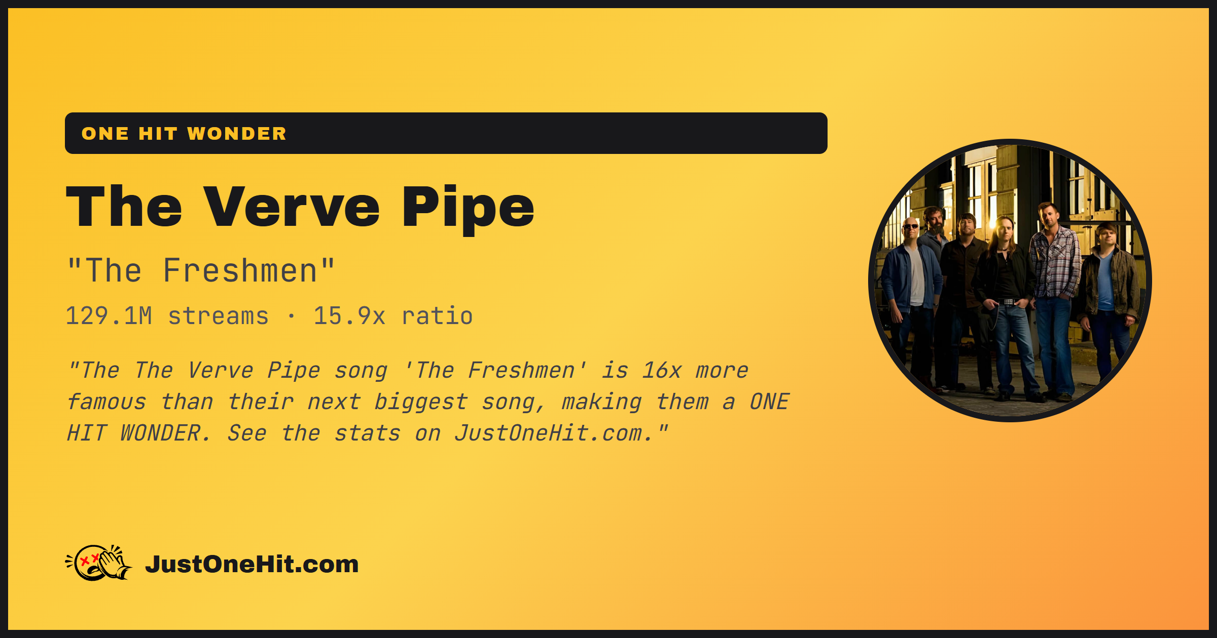 "The The Verve Pipe song 'The Freshmen' is 16x more famous than their next biggest song, making them a ONE HIT WONDER. See the stats on JustOneHit.com."