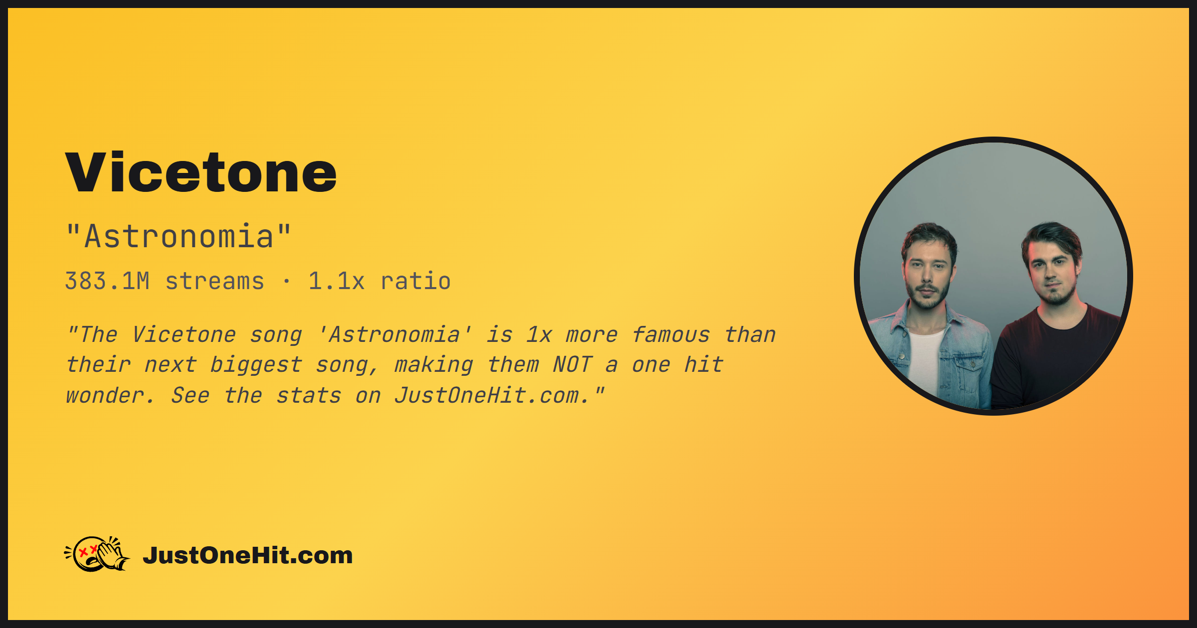 "The Vicetone song 'Astronomia' is 1x more famous than their next biggest song, making them NOT a one hit wonder. See the stats on JustOneHit.com."