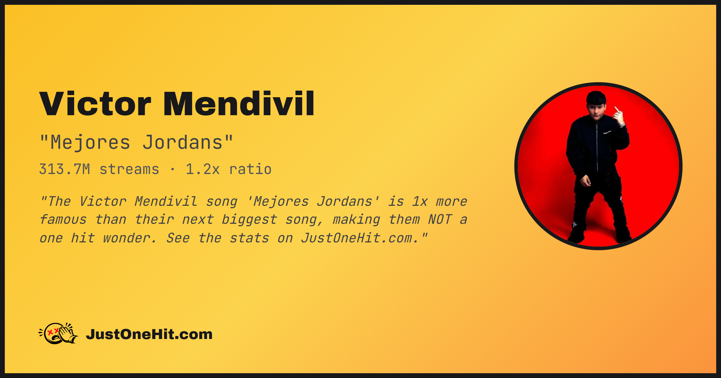 "The Victor Mendivil song 'Mejores Jordans' is 1x more famous than their next biggest song, making them NOT a one hit wonder. See the stats on JustOneHit.com."