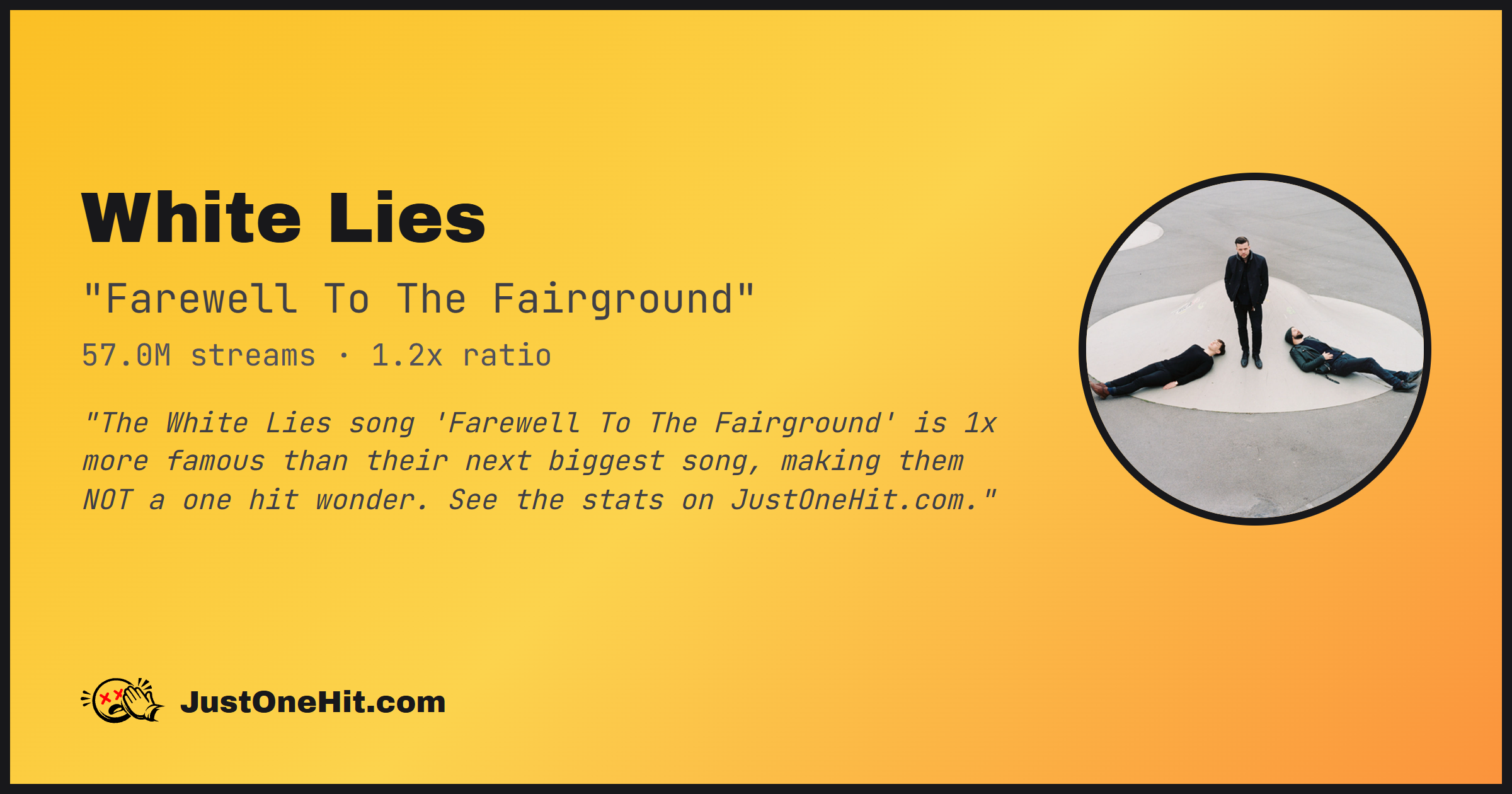 "The White Lies song 'Farewell To The Fairground' is 1x more famous than their next biggest song, making them NOT a one hit wonder. See the stats on JustOneHit.com."