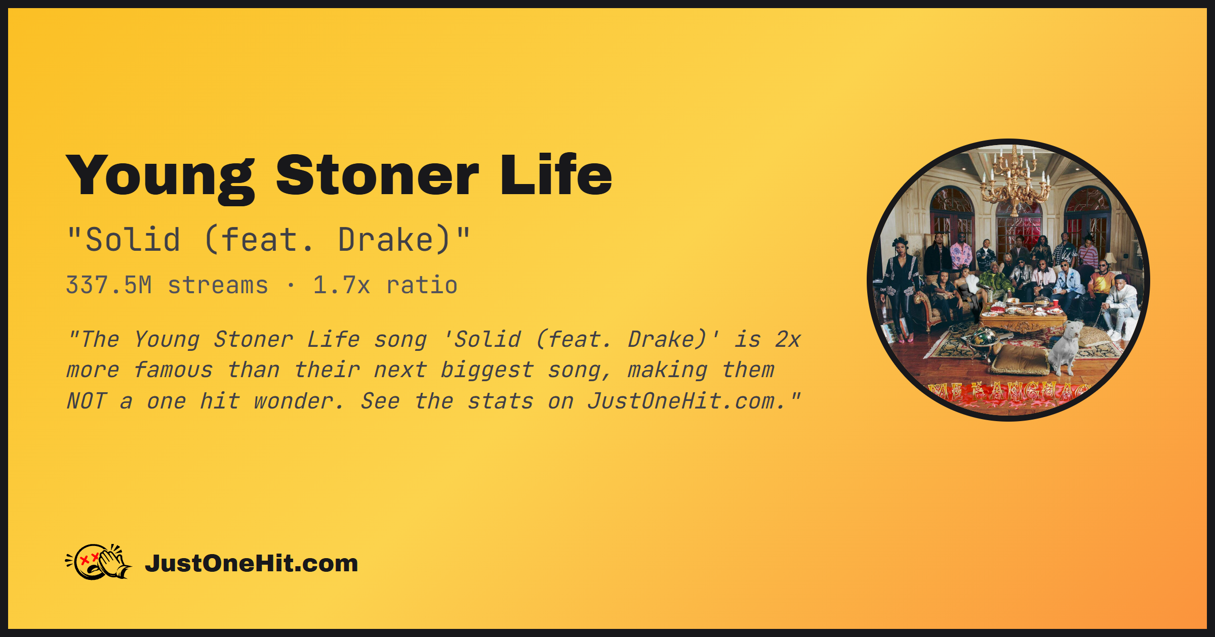 "The Young Stoner Life song 'Solid (feat. Drake)' is 2x more famous than their next biggest song, making them NOT a one hit wonder. See the stats on JustOneHit.com."